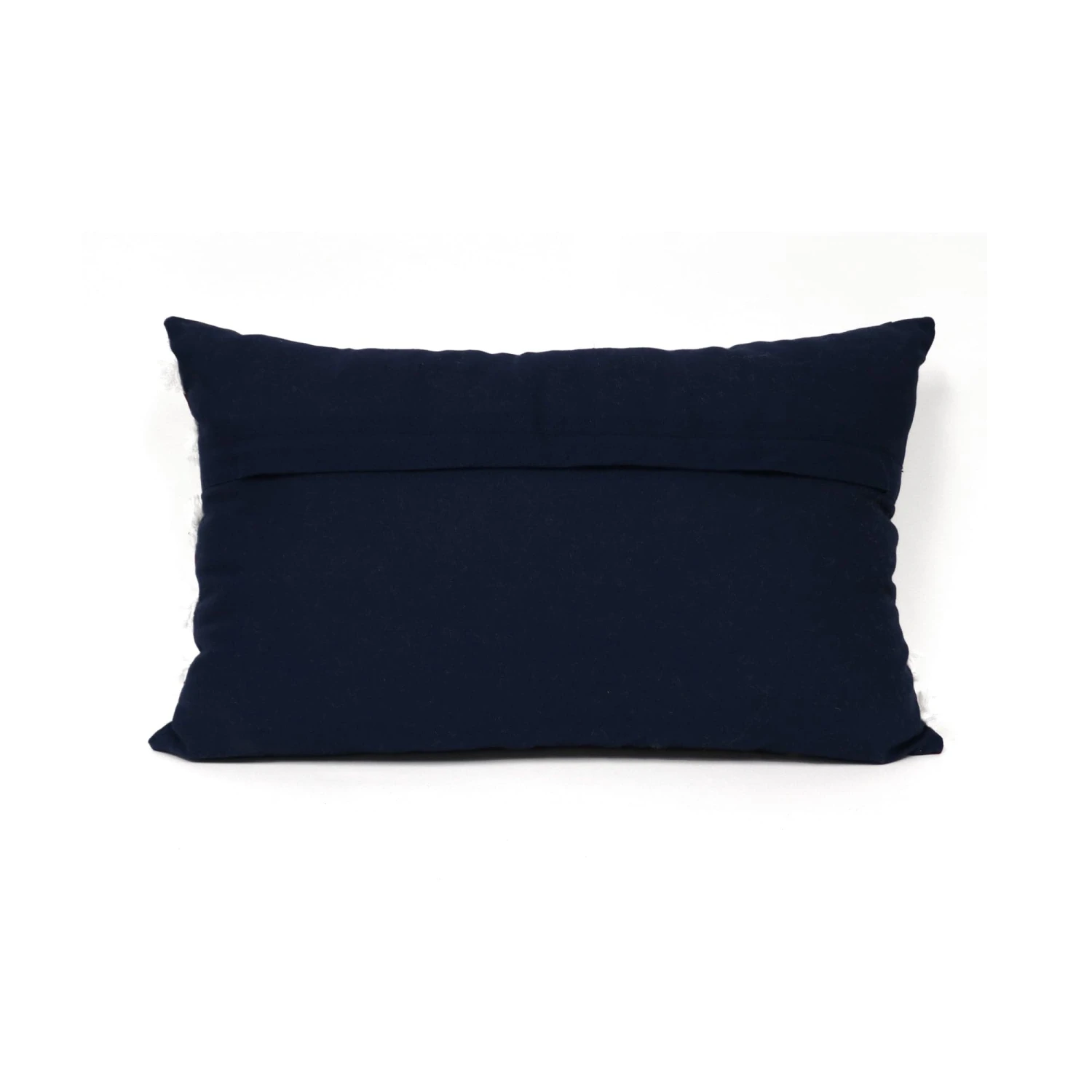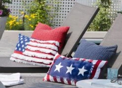 Celebrate your patriotic style with this American Flag Fringe Decorative Pillow. Made with 100% cotton, this printed Americana design shines with a classic red and navy color scheme. Fringe detail creates the white stripes for added texture and an eclectic look.