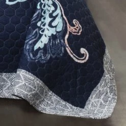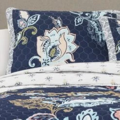 Our Aster Quilt 3 Piece Set features a delicate floral engineered pattern on 100% cotton. This soft cotton quilt set will add life to any bedroom with its bright pastel colors and large blooms with a full navy geometric border.