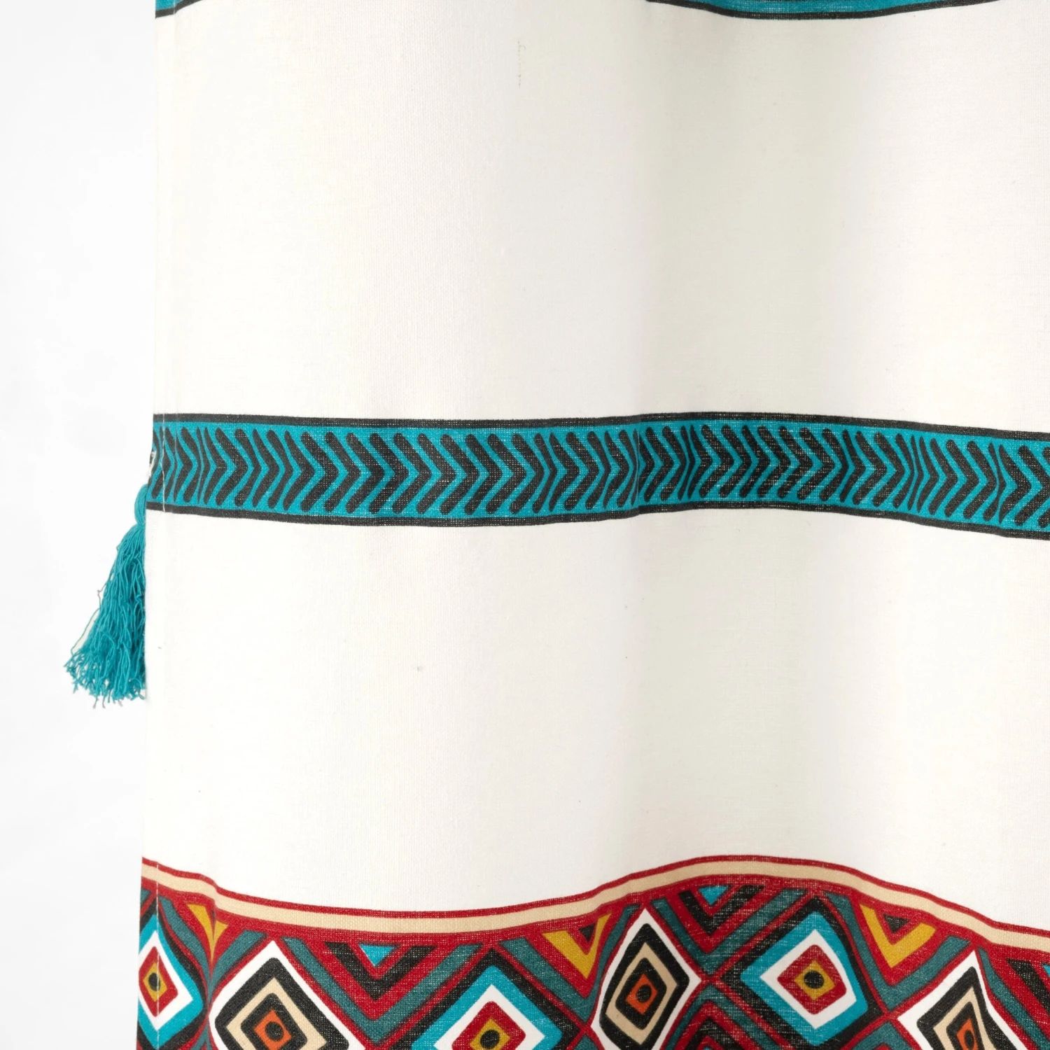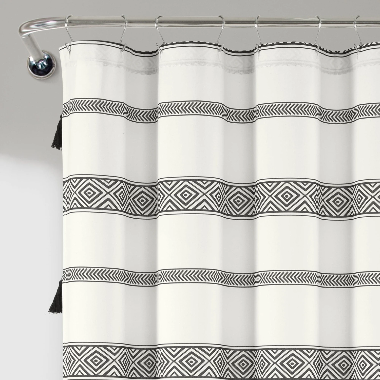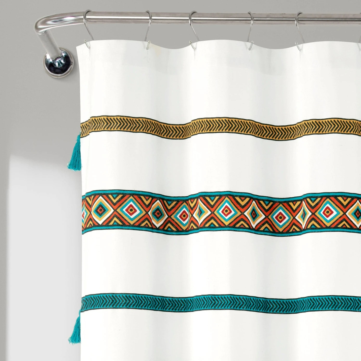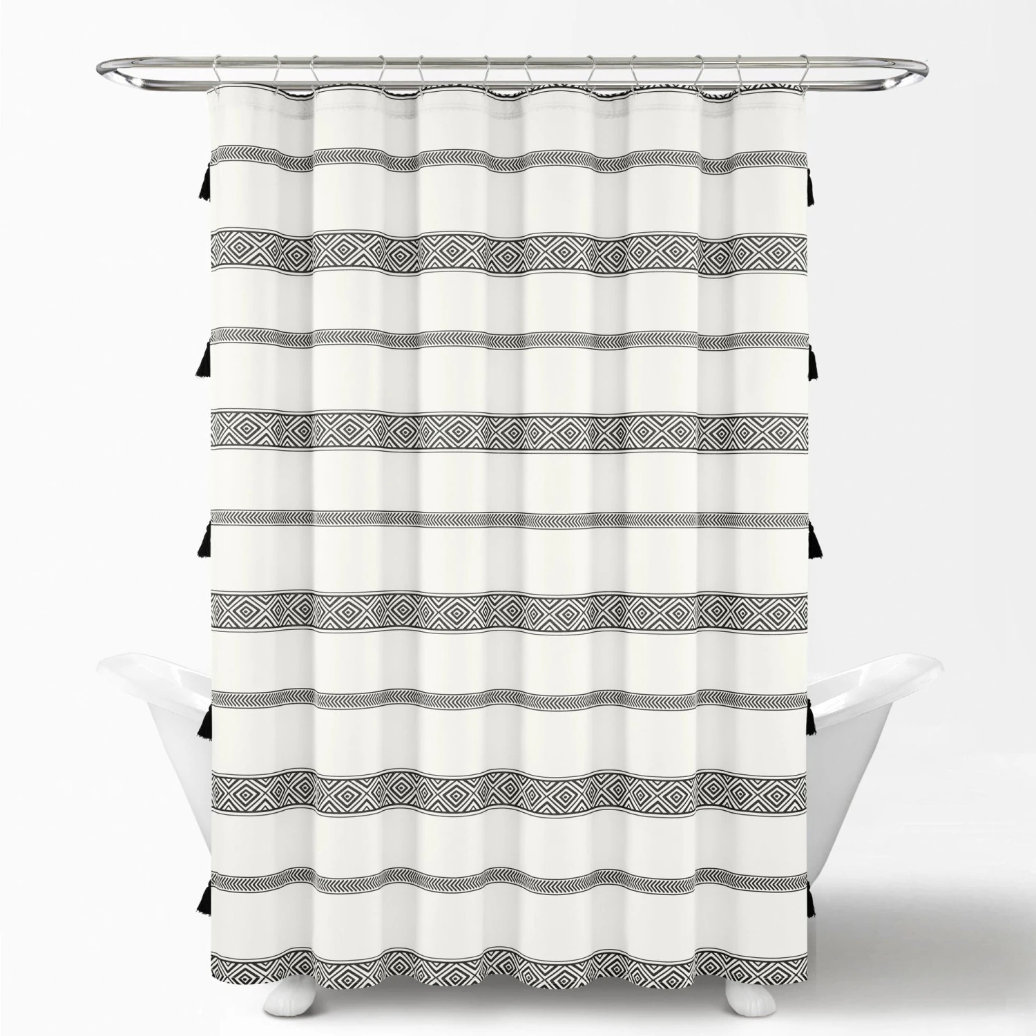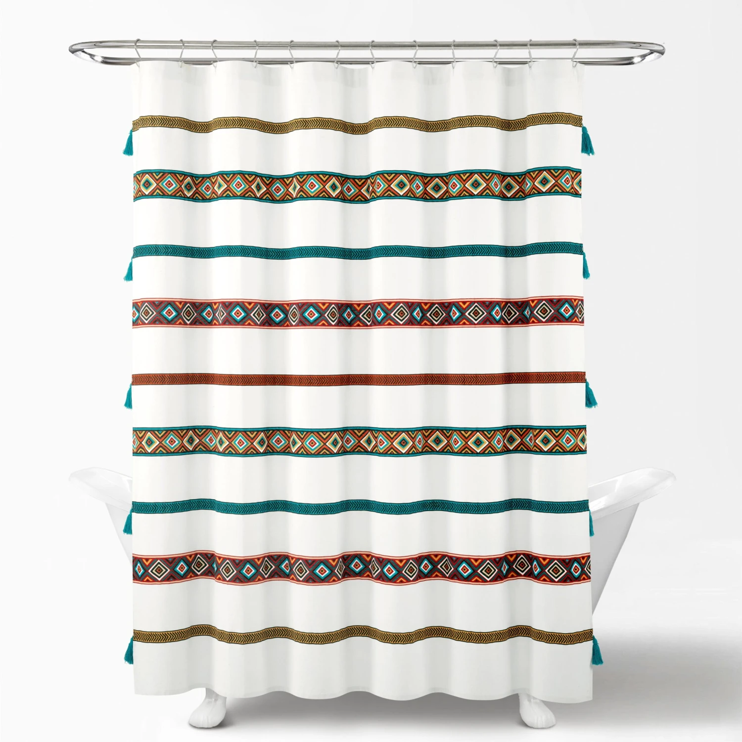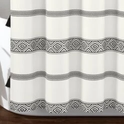 Dress your bohemian bathroom with the chic style of this decorative Ava Boho Stripe Tassel Yarn Dyed Recycled Cotton Shower Curtain. The stripes of diamond pattern and stylish little tassels can inspire a complete bohemian look. Coordinate your towels and decor with the colors of this curtain to polish off your space.