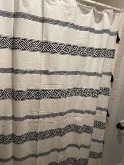 The recycled cotton blend fabric gives the Ava Boho Stripe Tassel Yarn Dyed Recycled Cotton Shower Curtain an excellent hand feel. Because it is a fabric shower curtain, we do recommend using a liner as well (not included).