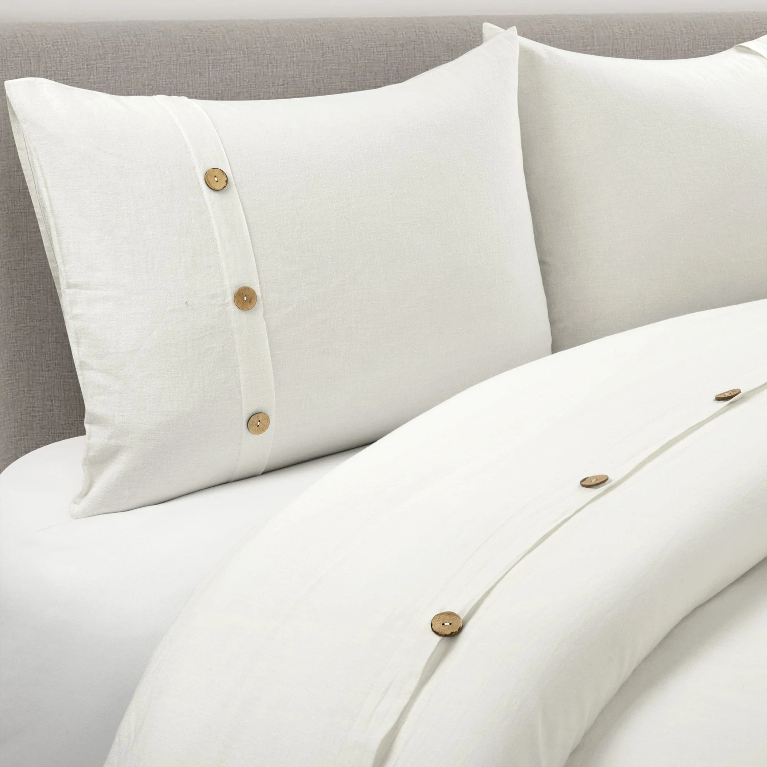 Luxury and comfort find a harmonious balance with this Belgian Flax Linen Rich Cotton Blend Duvet Cover 3 Piece Set. Thermal regulation and durability are just a few of the superior benefits of this fabric Belgian flax cotton blend. Garment washed for appearance and comfort, this duvet cover and matching shams are embellished with coconut shaded summarys for a casual yet elegant look.