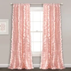 The Belle Window Curtain is 84 inches long and 54 inches wide. These panels are available in your choice of white, ivory, gray, blush and bright pink. This style is sold by the individual panel.