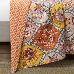 Printed on lightweight breathable cotton, this Bohemian Flower Cotton Quilt 3 Piece Set is oversized for your year round comfort. And when you want to change things up, simply flip it over to the graphic leaf print on the reverse. Texture is brought to the quilt and two matching shams with the stitched onion quilting pattern.
