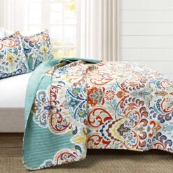 The Boho Chic Quilt 3 Piece Set includes one soft 100% cotton reversible quilt and two matching pillow shams. It is available in both Full/Queen and King sizes.