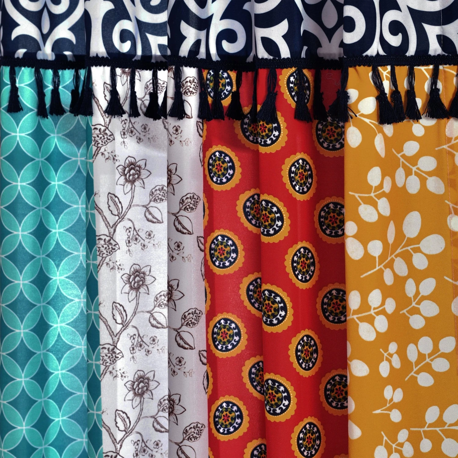 These bohemian style curtains will brighten your home and your mood. The patchwork style columns of colorful floral and geometric patterns are printed on fabric that allows natural light into the room. Tassels run across the top portion of each panel in this Boho Patch Window Curtain Panel Set.