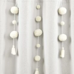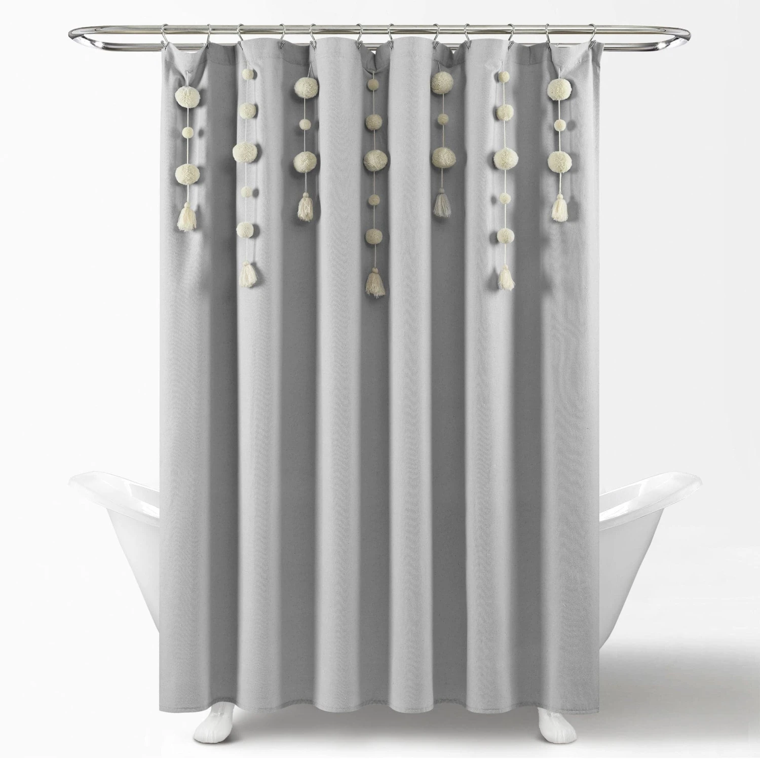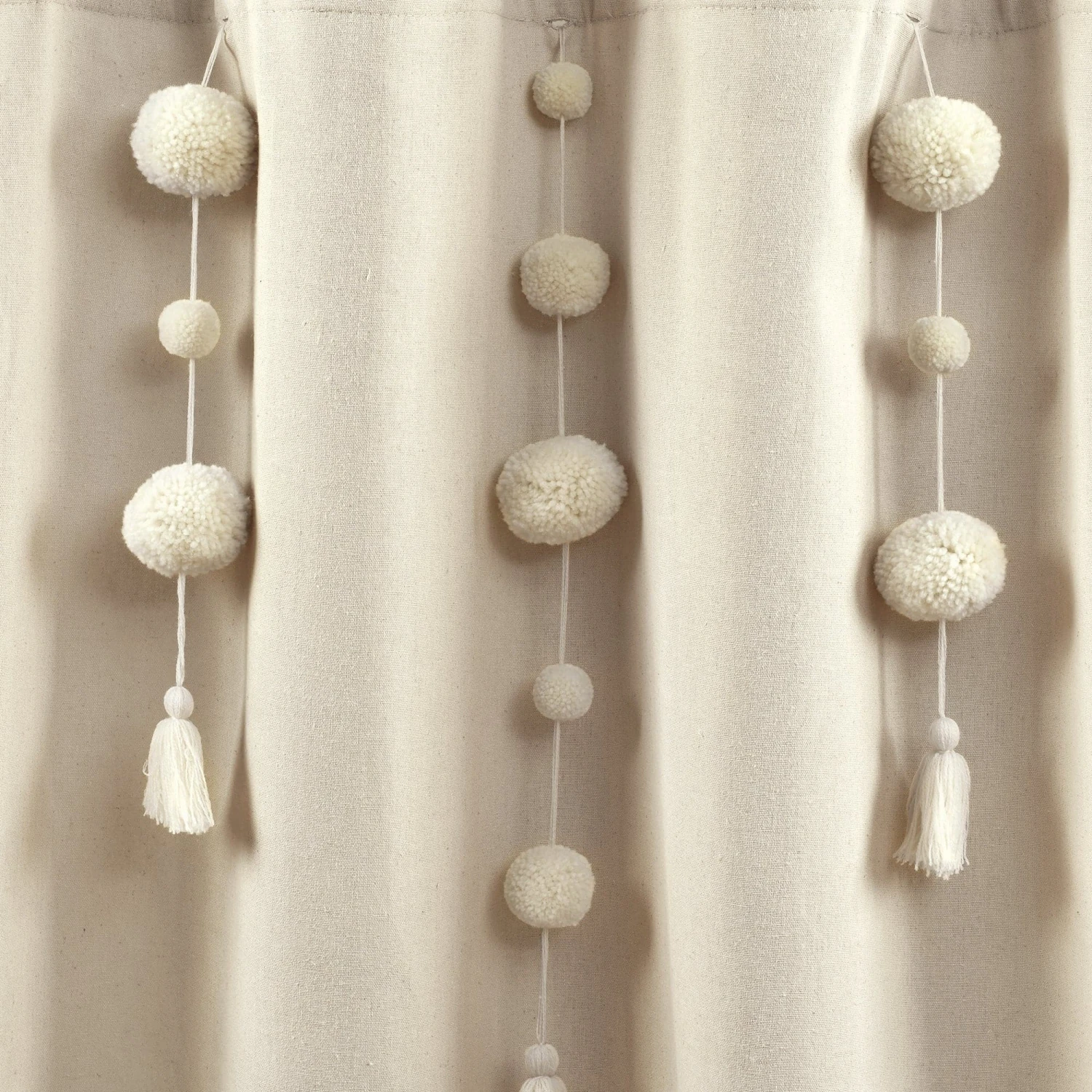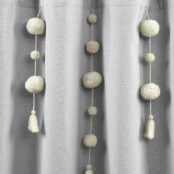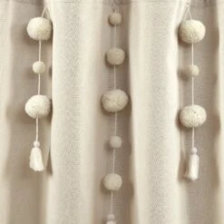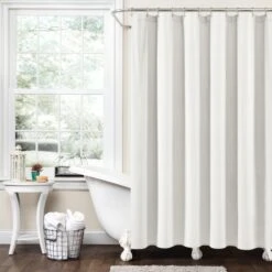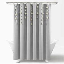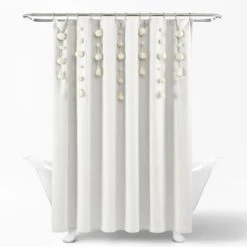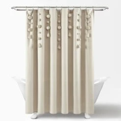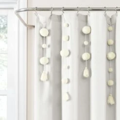 Dress your bathroom with fun and elegant style with this faux linen shower curtain featuring pom poms of various sizes cascading down the top portion of the curtain. The pom pom tassels create a waterfall effect for a high fashion look for your home. You can also remove the pom pom tassels from the Boho Pom Pom Tassel Faux Linen Shower Curtain for a more subdued look or for machine washing.