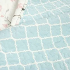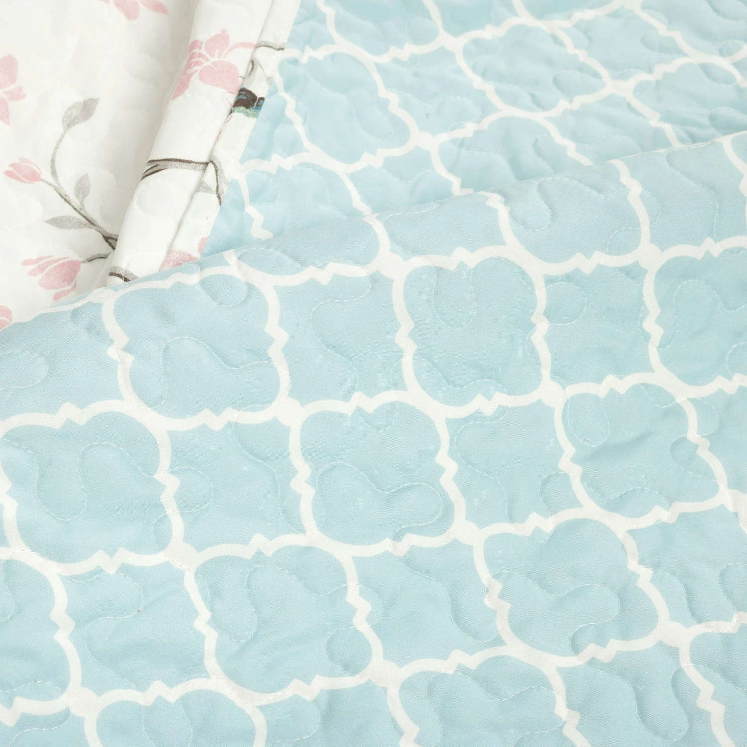 Oversized for added coverage and comfort, this Botanical Bird & Flower Quilt 3 Piece Set is the perfect accessory for a well styled look. This front features a natural print in soothing colors, and the reverse features a modern geometric trellis print. This gives you the option to switch up the look of your room as often as you like just by turning the quilt over to the other side.