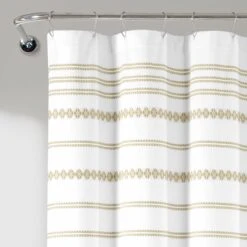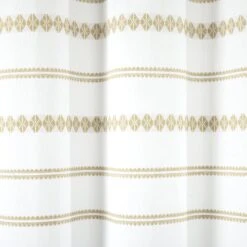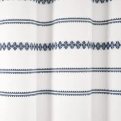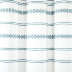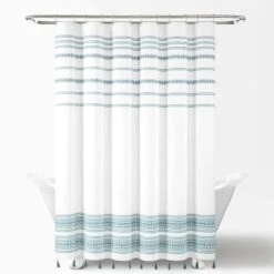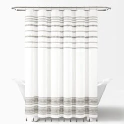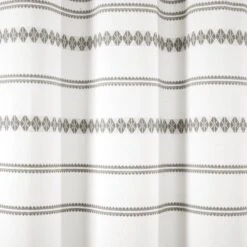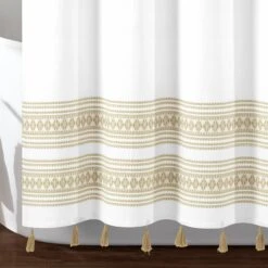 Add this chic Aztec inspired shower curtain to your primary, guest, or teen’s bathroom. This Breezy Chic Tassel Jacquard Recycled Cotton Shower Curtain has a white base with an intricate woven jacquard pattern that displays different geometric stripes accented with matching colored tassels at the bottom.