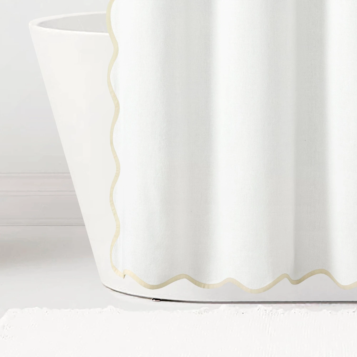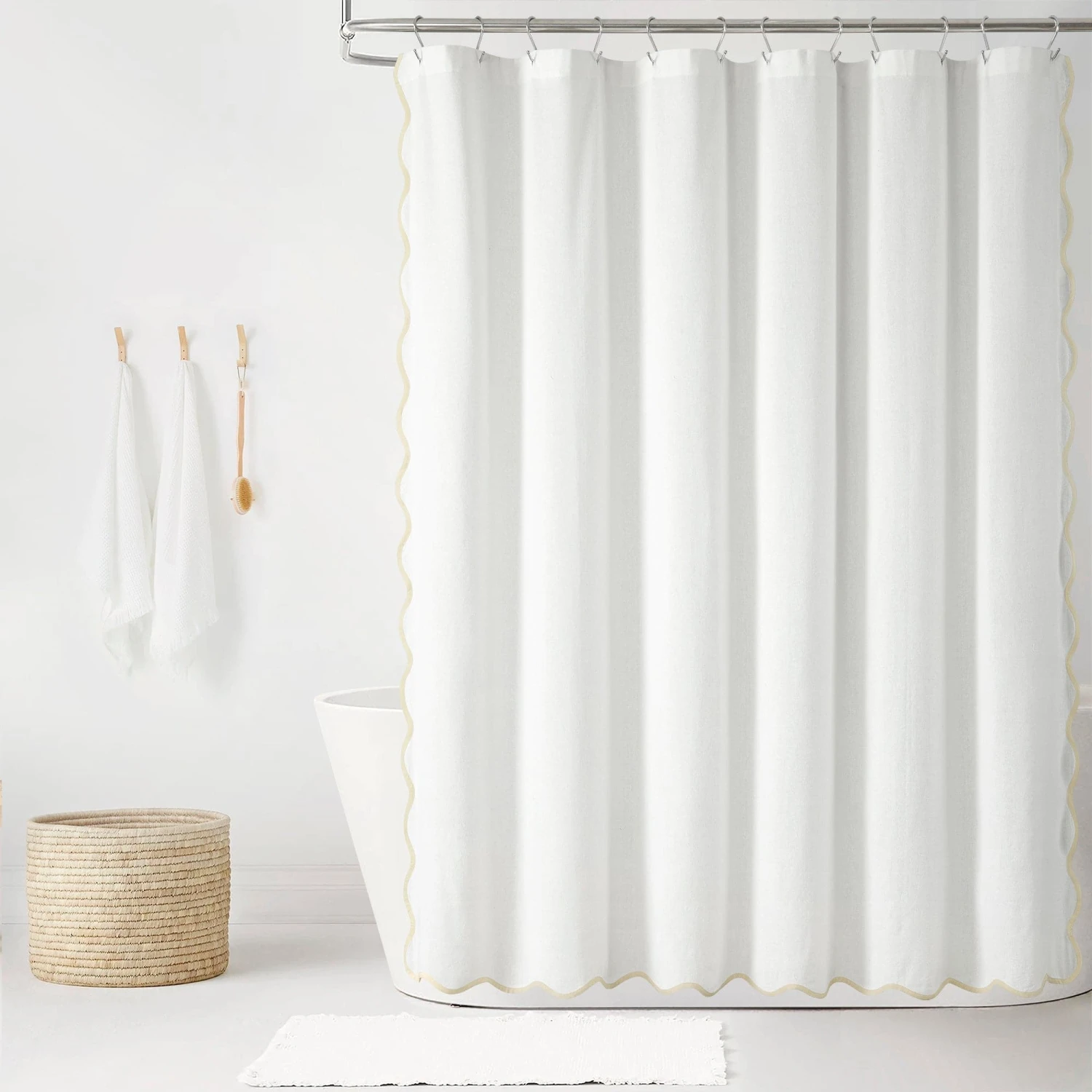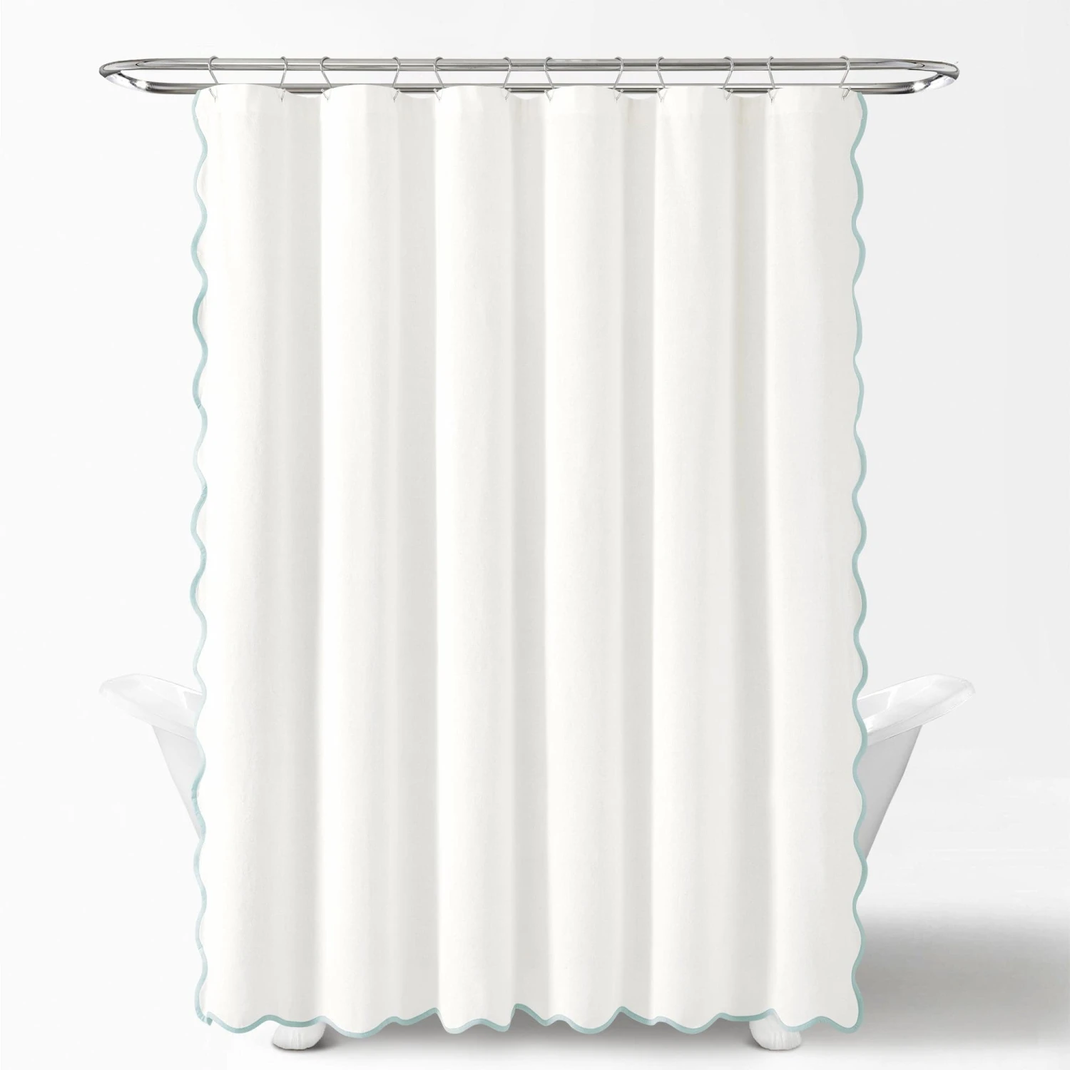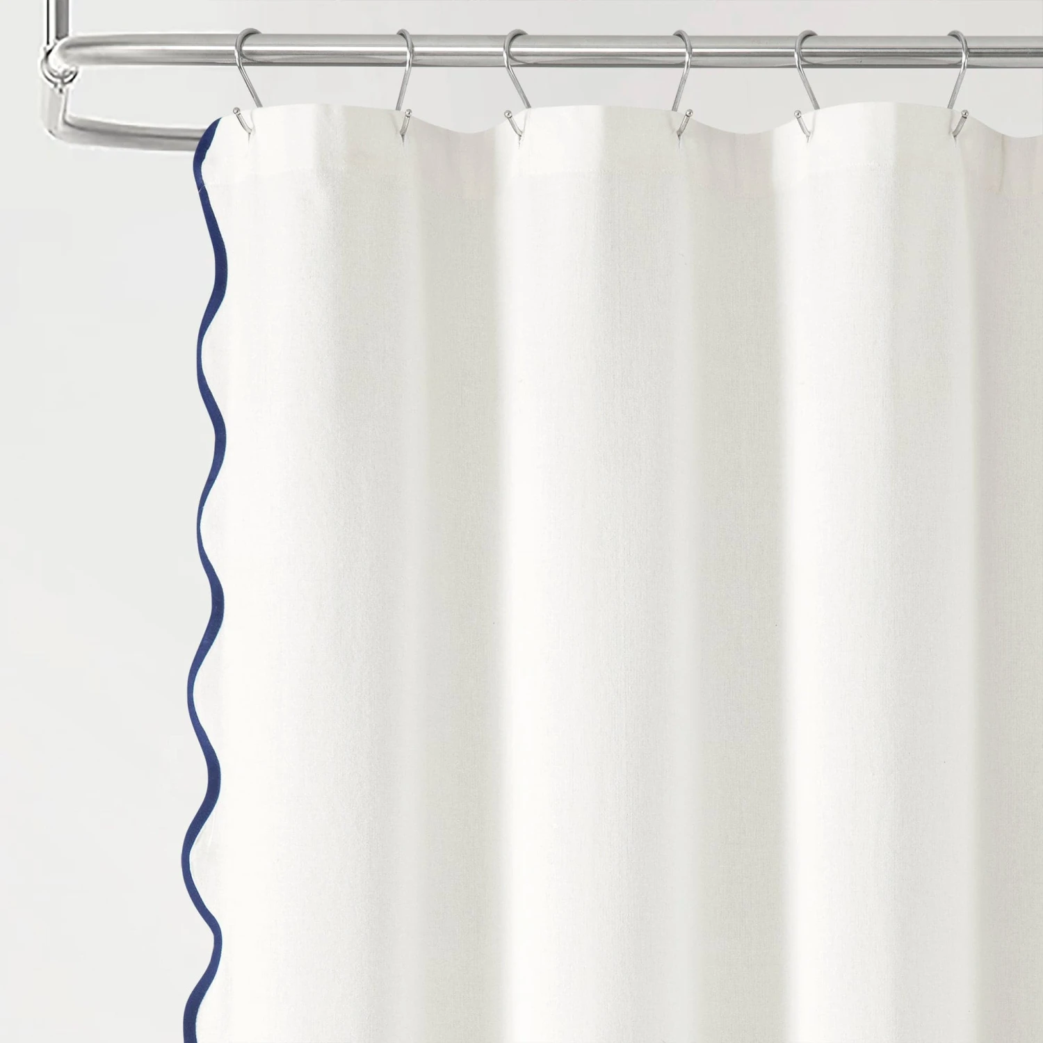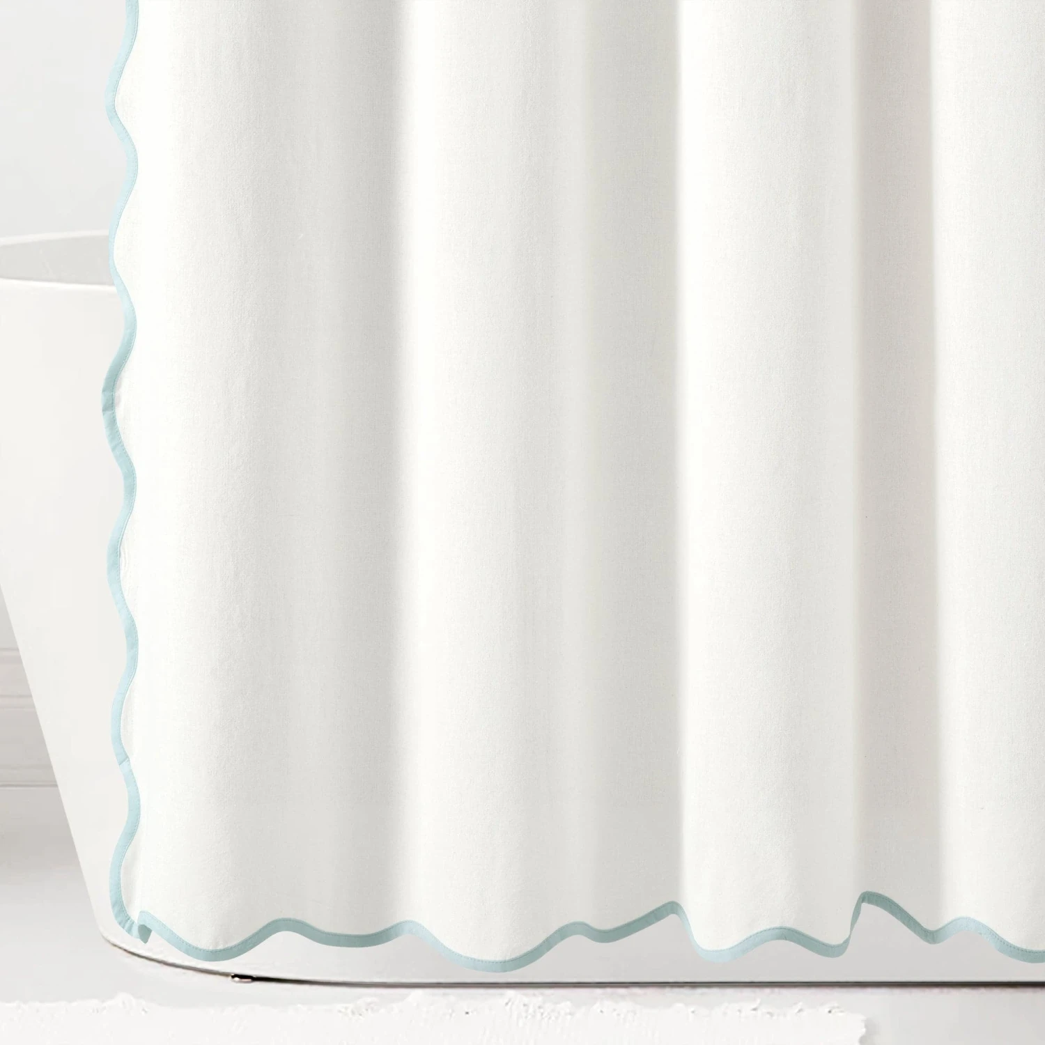 Bring a perfect blend of breezy seaside charm and practical elegance for your bathroom with this Coastal Chic Scallop Edge Shower Curtain. The scalloped edge design, reminiscent of the rolling waves along the shoreline, infuses your bathroom with a tranquil coastal ambiance.