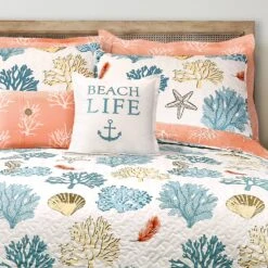 Coral reefs and feathers combine to create a stunning reversible quilt set perfect for your own room or your guests. The Coastal Reef Feather Reversible Quilt Set is sure to add new energy to any bedroom.