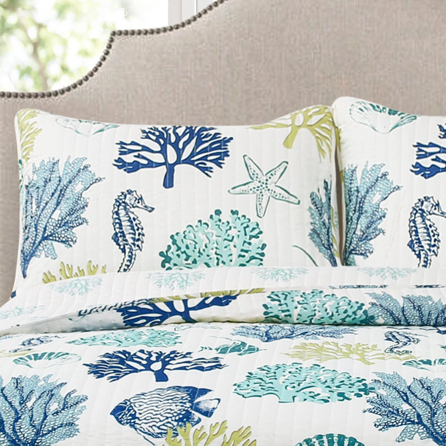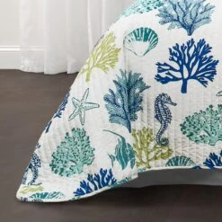 The reverse side of the Coastal Reef Quilt 3 Piece Set is light colored reefs on a white background. The reversible nature of this quilt gives you the option to switch up the look of your room as often as you like simply by turning the quilt over.