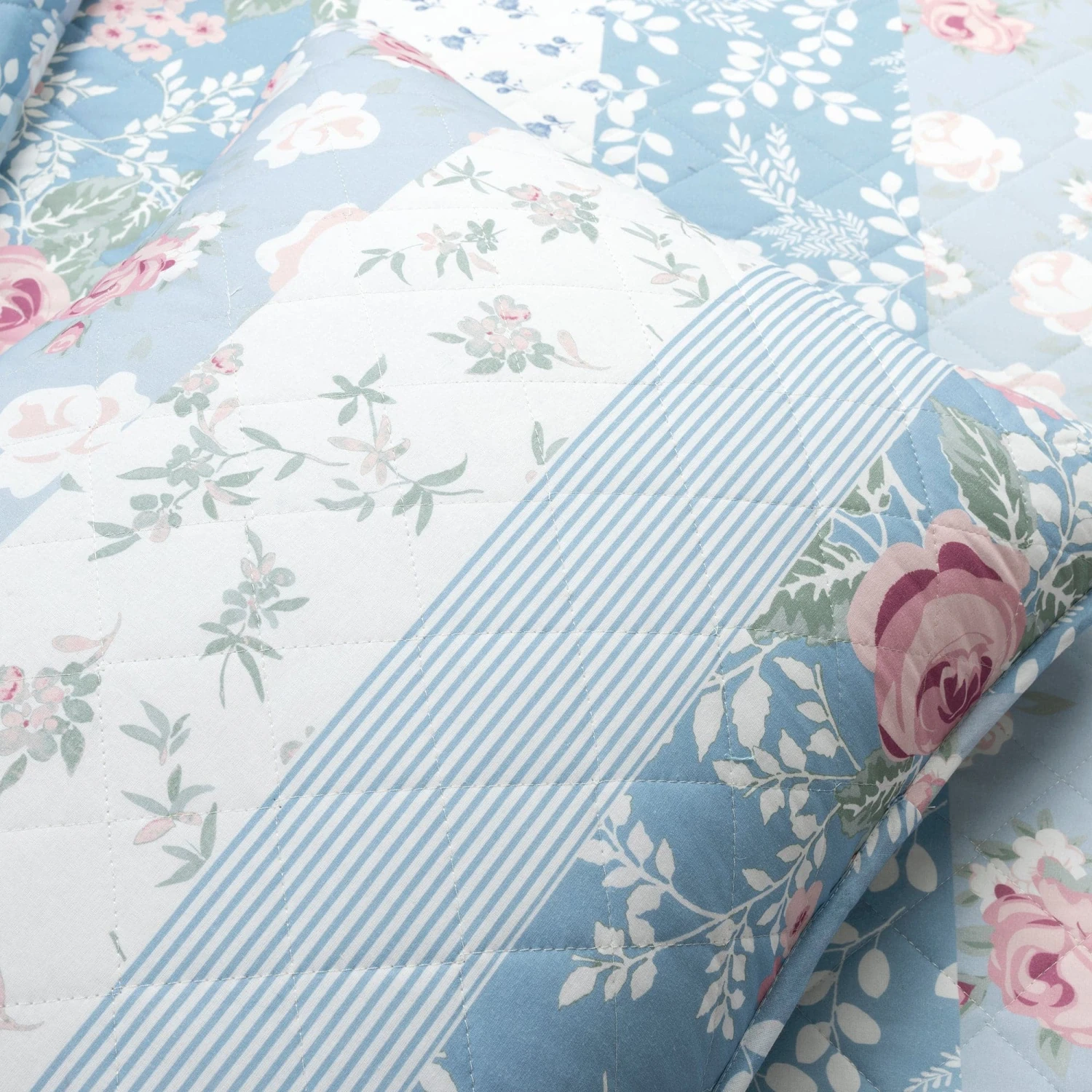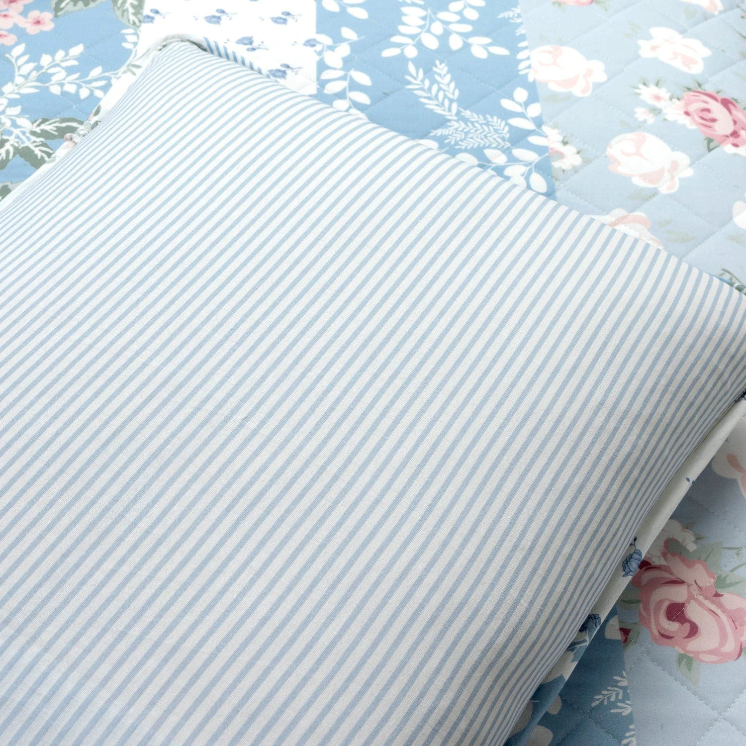 The Cottagecore Flower Stripe Cotton Quilt 3 Piece Set includes a soft reversible quilt and two matching pillow shams. It is available in your choice of Full/Queen or King Sizes.