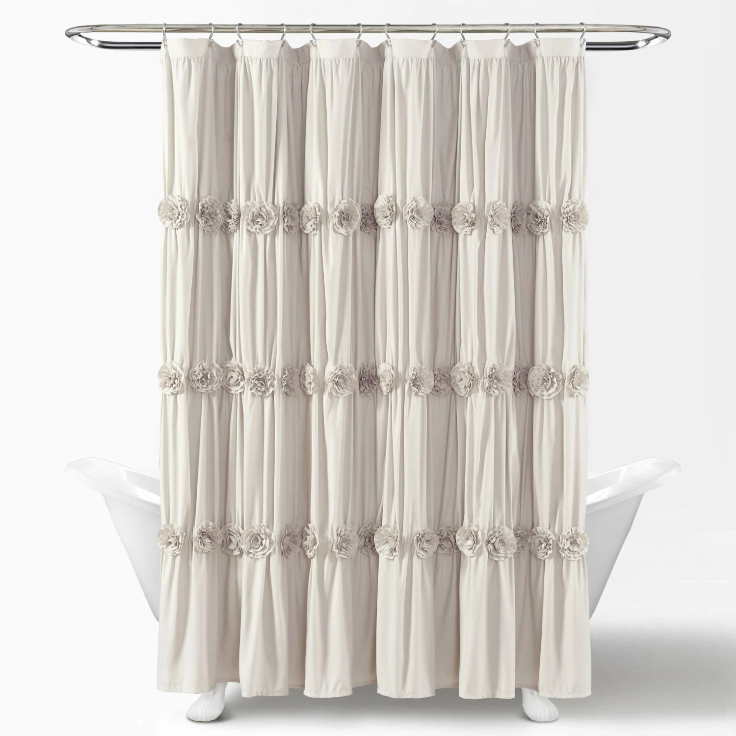 It’s soft to the touch and will hold up well even in the most humid bathroom conditions. However, due to the delicate nature of the floral embellishments, the Darla Shower Curtain should only be dry cleaned.