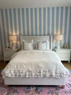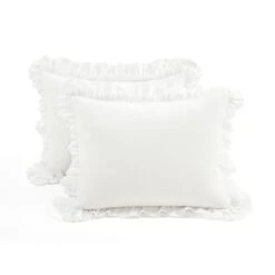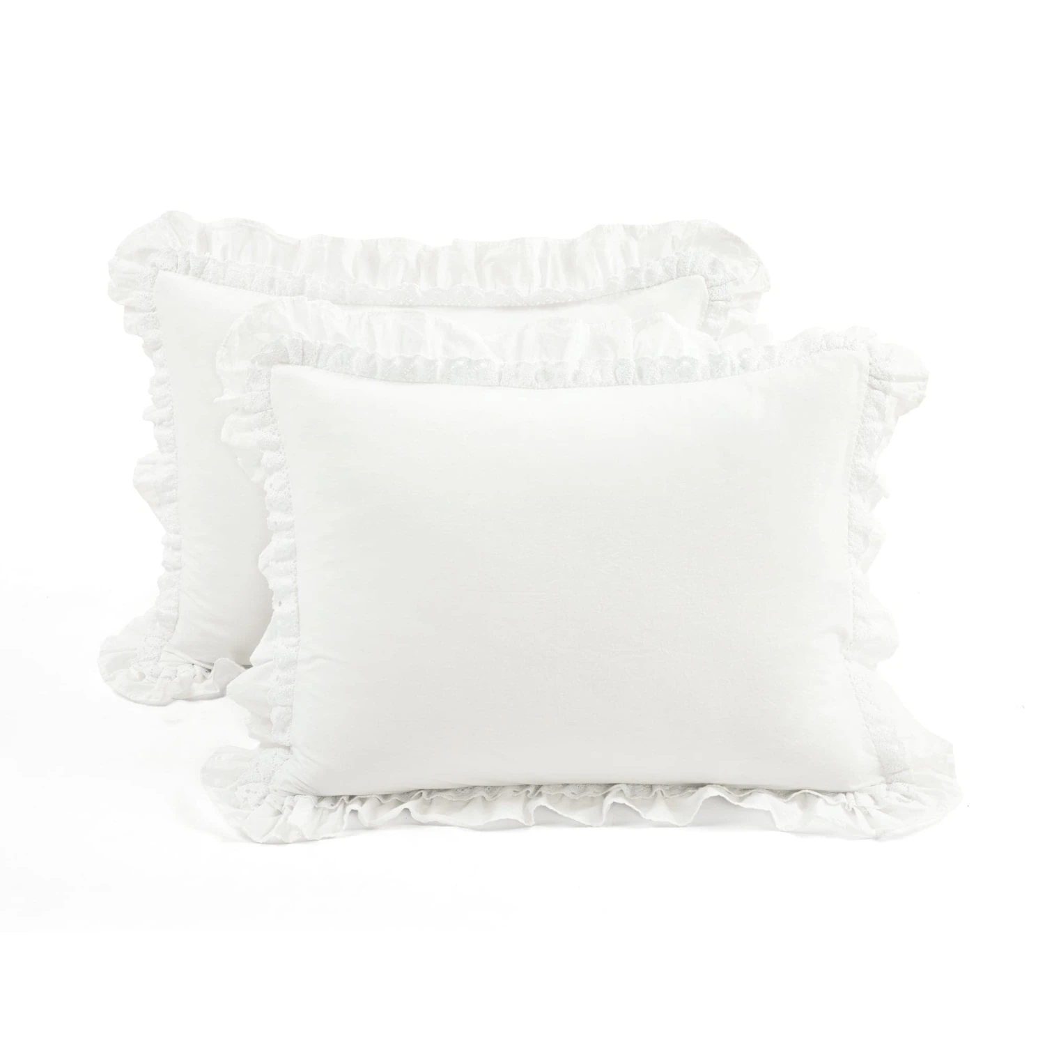The Ella Ruffle Lace 100% Cotton Duvet Cover 3 Piece Set includes a soft and luxurious duvet cover and two matching pillow shams. The pillow shams even have the ruffled edges with the lace trim! It is available in both King and Full/Queen sizes.