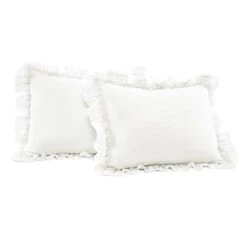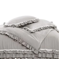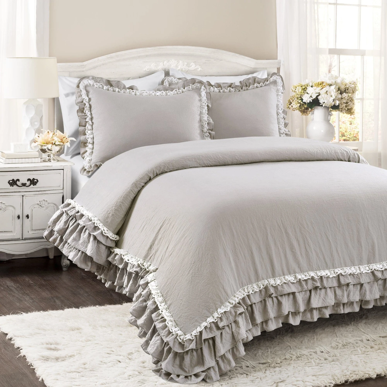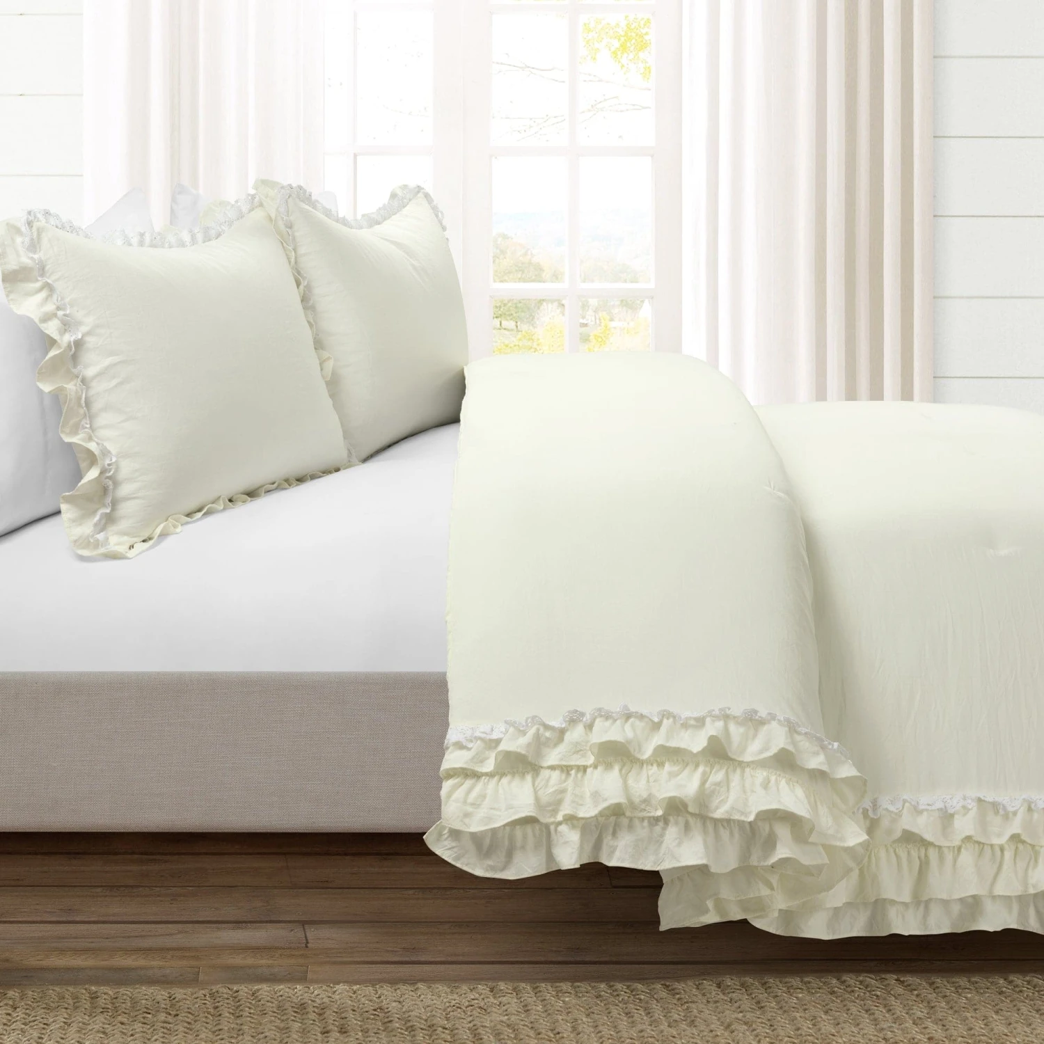 This charming Ella Ruffle Lace 3 Piece Comforter Set will add a touch of feminine style to any bedroom in your home. The lace trim and layers of ruffles add flair to an otherwise minimalist look that can also fit into farmhouse, shabby chic, traditional or French Country themes.