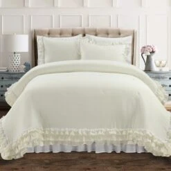 The ruffles on the quilt and the pillow shams create a whole new dimension to the bedroom. The Ella Ruffle Lace 3 Piece Comforter Set has a calming effect, adding a touch of elegance and loads of style with its frilly look on solid color.