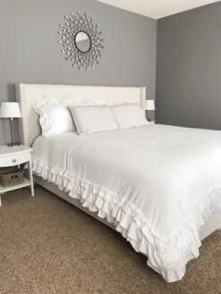 The Ella Ruffle Lace 3 Piece Comforter Set includes a soft and luxurious 230 GSM comforter and two matching pillow shams. The pillow shams even have the ruffled edges with the lace trim! It is available in both King and Full/Queen sizes in four neutral options, including white, ivory, neutral, and light gray.