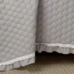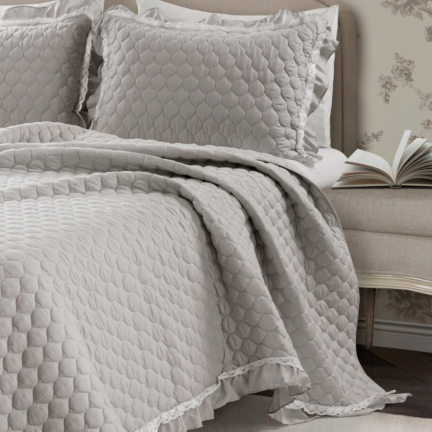 The Ella Ruffle Lace 3 Piece Quilt Set includes a soft and luxurious quilt and two matching pillow shams. The pillow shams even have the ruffled edges with the lace trim! It is available in both King and Full/Queen sizes in three neutral options, including white, neutral and light gray.