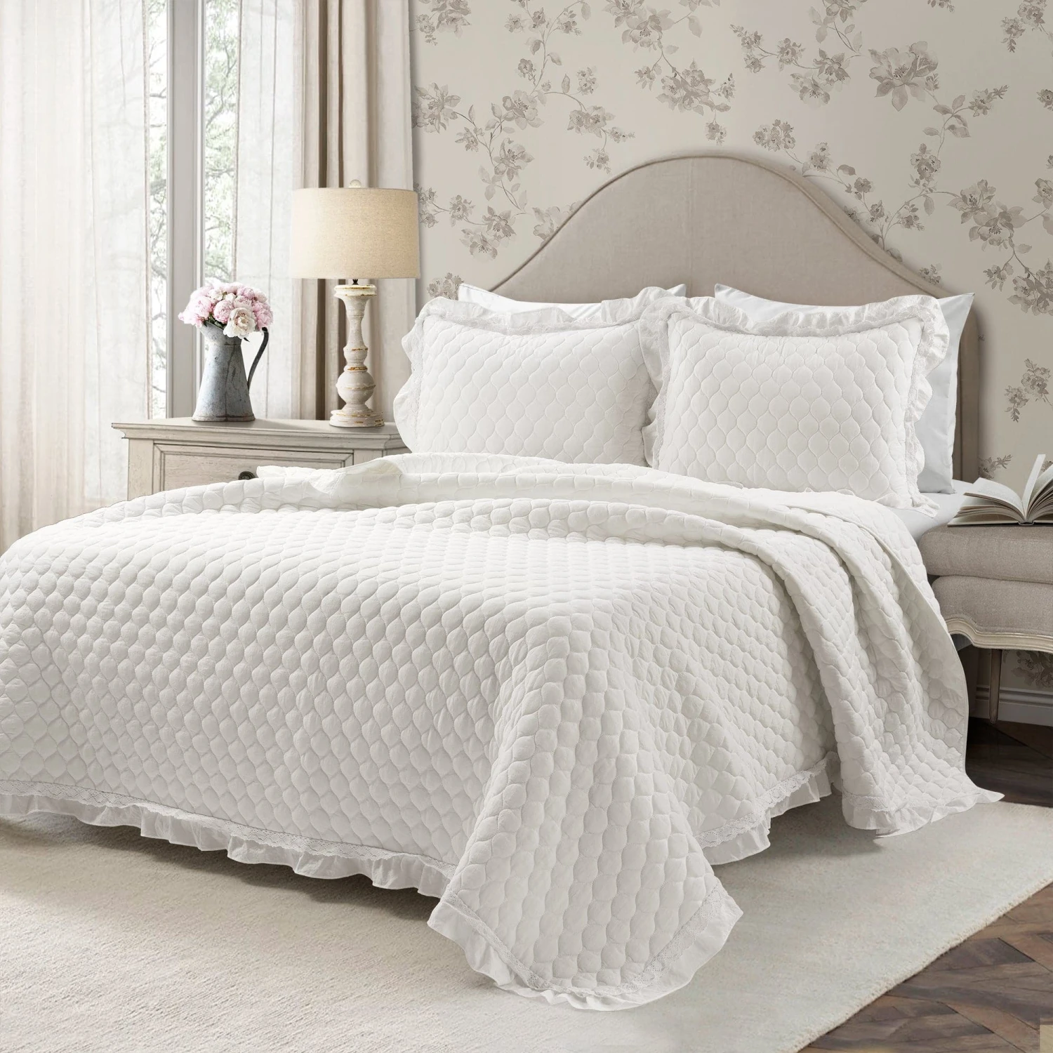 This charming Ella Ruffle Lace 3 Piece Quilt Set will add a touch of elegant and feminine style to any bedroom in your home. The lace trim and layers of ruffles add flair to an otherwise minimalist look that can also fit into farmhouse, cottage, traditional or French Country themes.
