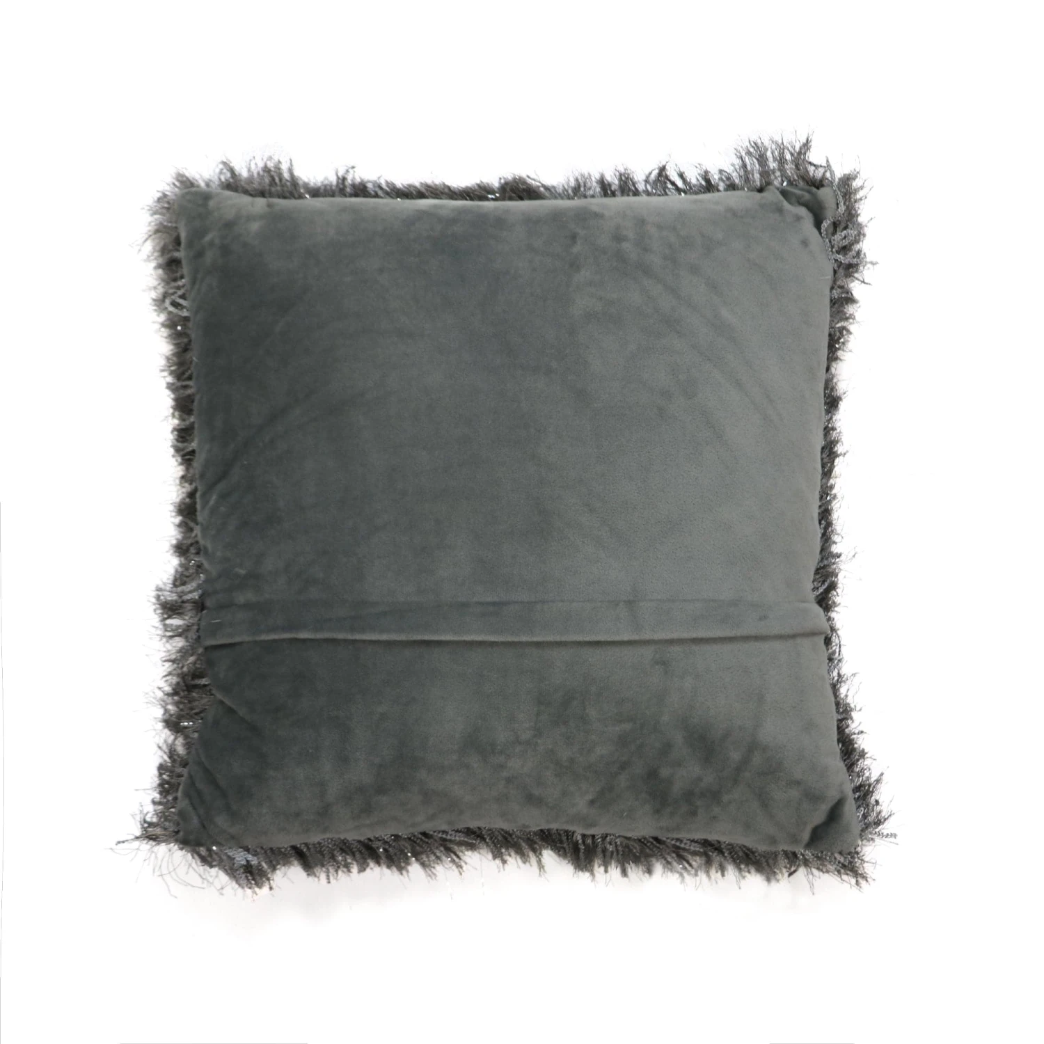 The front of the Ella Shaggy Fur Decorative Pillow has the textured faux fur, while the back of the pillow has a smooth solid color back.