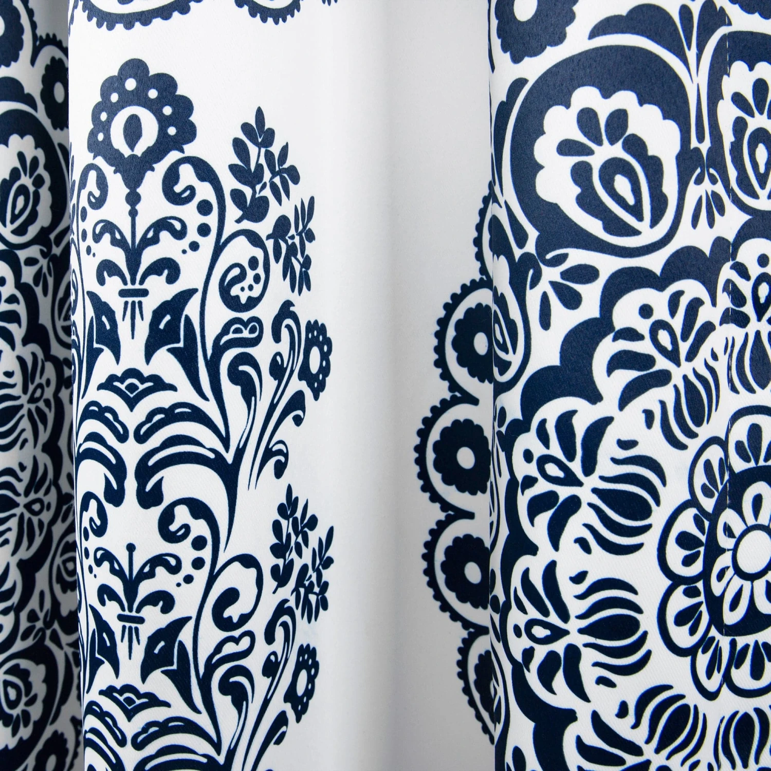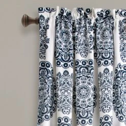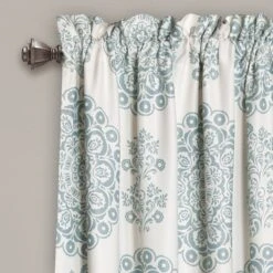 The Evelyn Medallion Light Filtering Window Curtain Set is sold by the pair. Each panel measures 84 inches or 95 inches in length and 52 inches wide with a 2″ header.