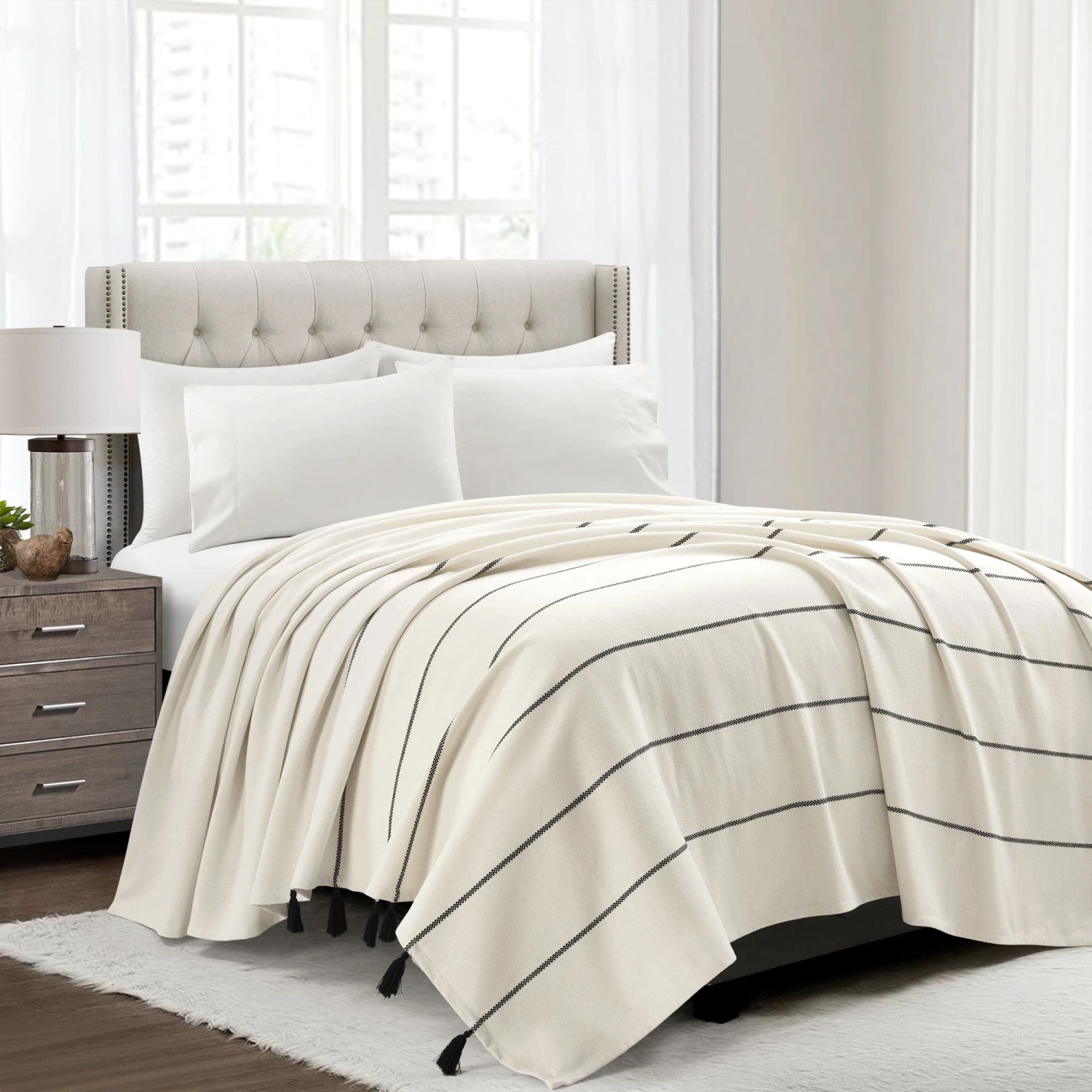 Cozy up your bedroom style with this Farmhouse Boho Stripe Woven Tassel Yarn Dyed Cotton Blanket/Coverlet. Textured stripes run across the coverlet giving your space dimension and a chic update on a classic look. The hanging tassels add character to your bedroom and can inspire other fun detailing throughout your space. The yarn dyed cotton lasts longer through each use and will not fade as quickly.
