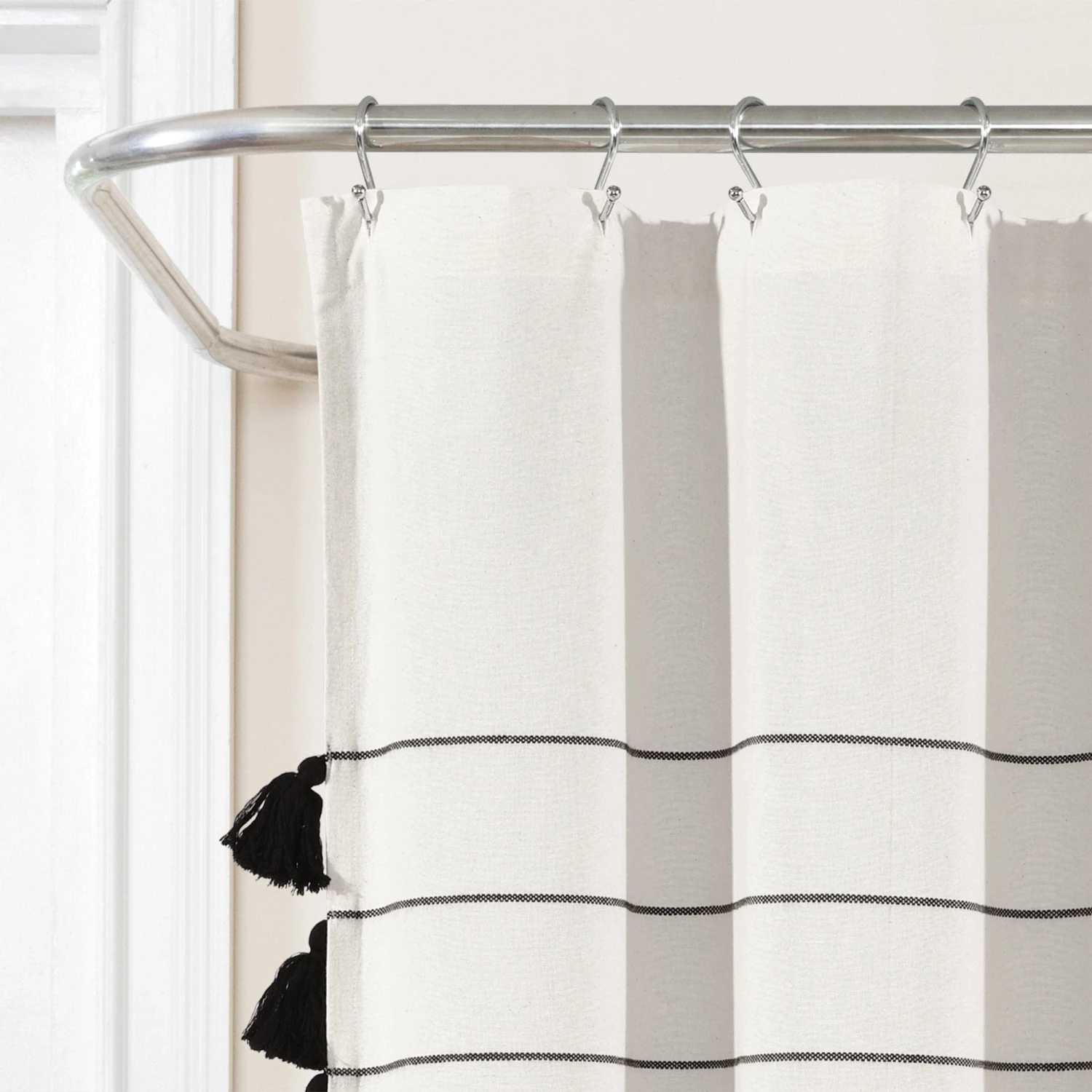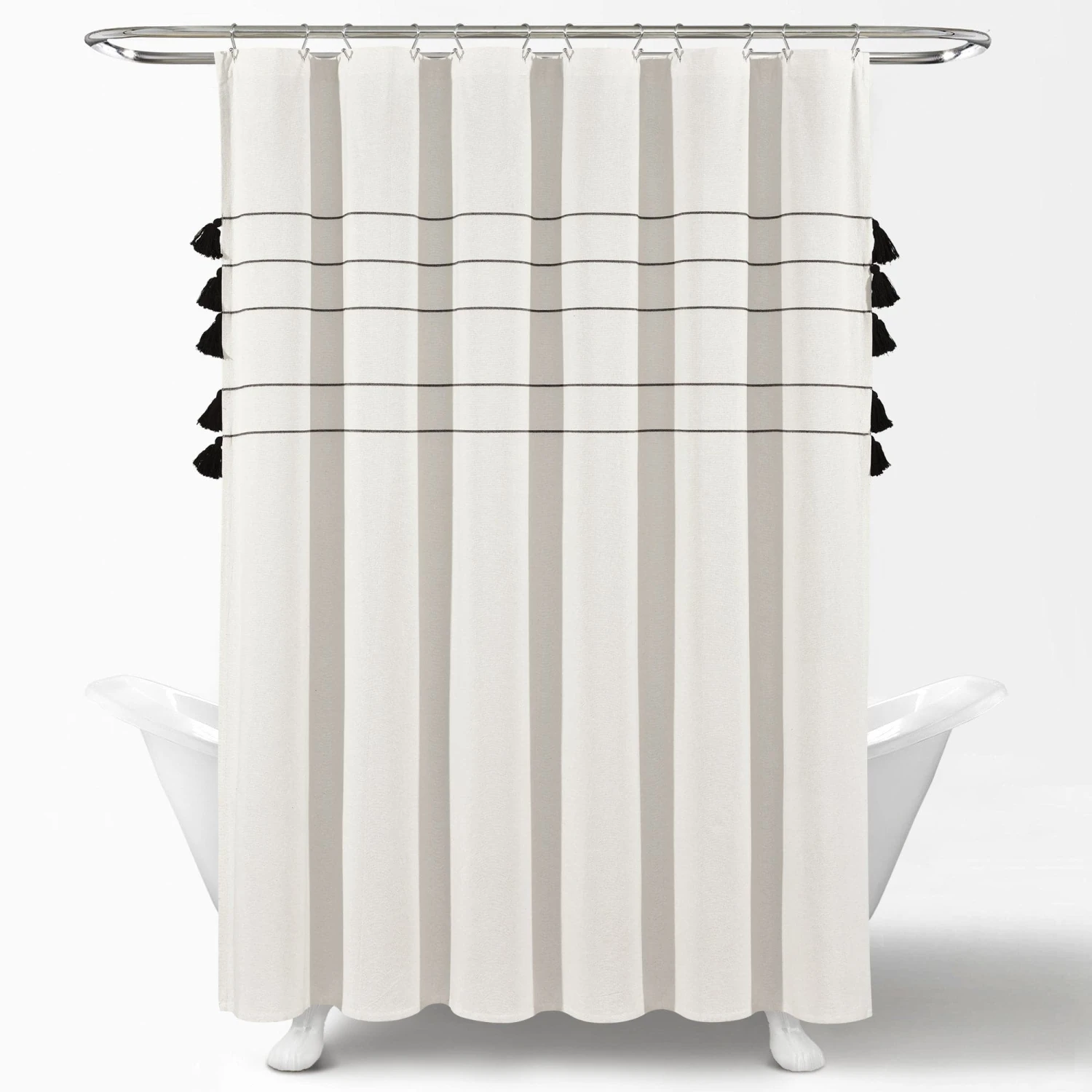 Measuring 72 inches wide and 72 inches long, our Farmhouse Boho Stripe Woven Tassel Yarn Dyed Cotton Shower Curtain will fit most standard bathtubs. It installs easily with any shower curtain rings or hooks.