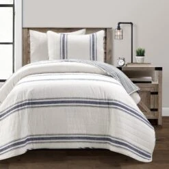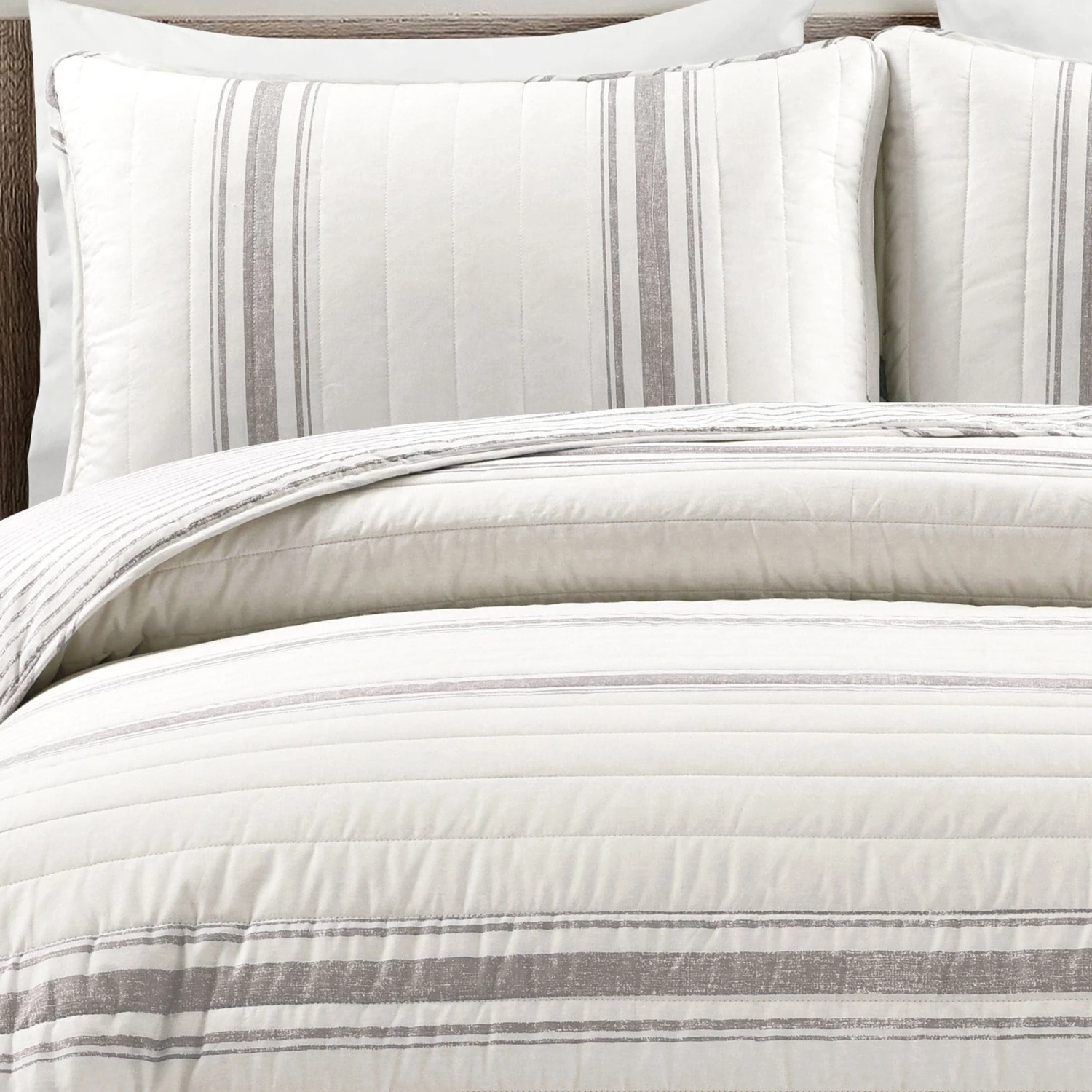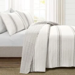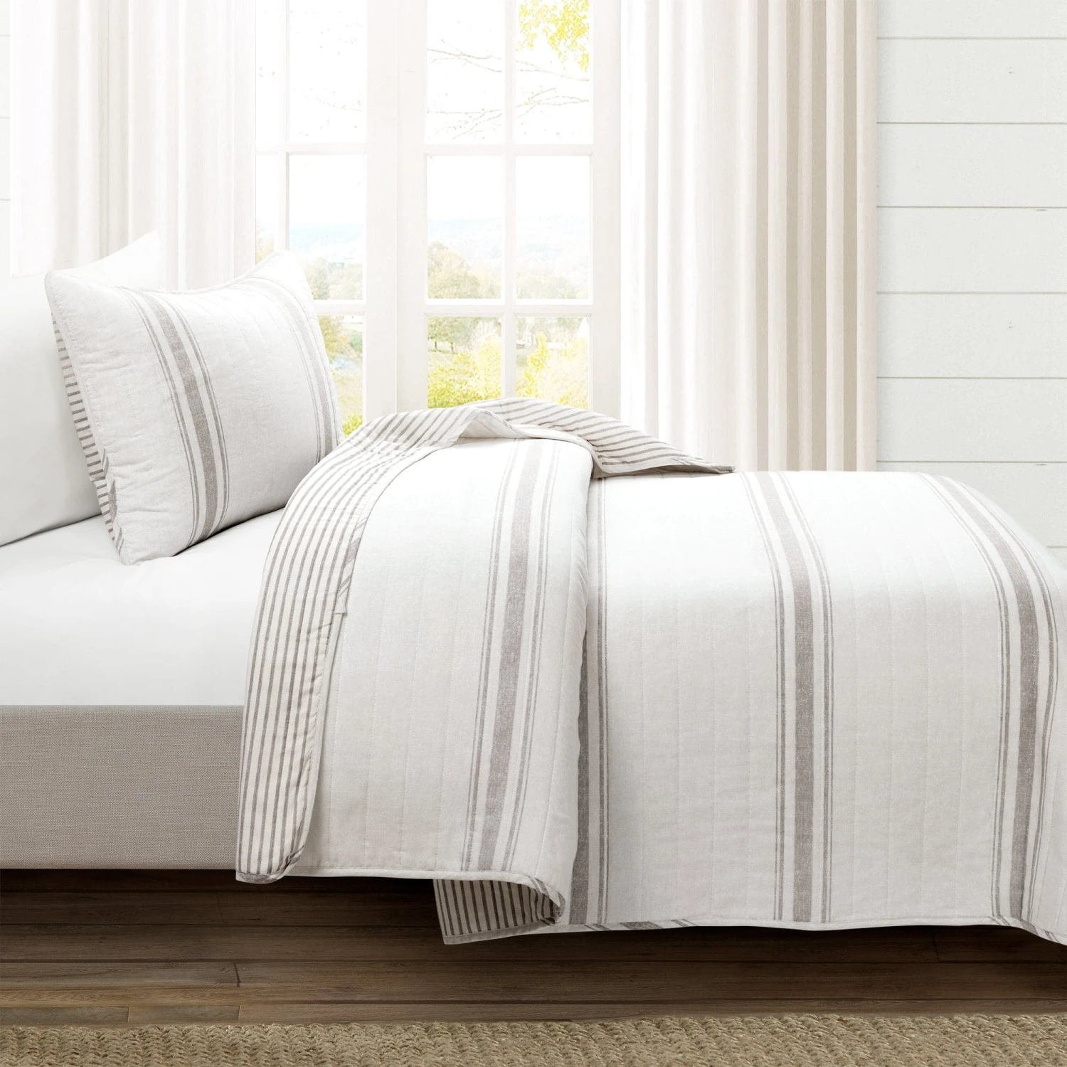 This Farmhouse Stripe Reversible Cotton Quilt Set includes a reversible 100% cotton quilt and matching reversible pillow shams (1 sham for Twin XL, 2 shams for full/queen, king and California king sizes).