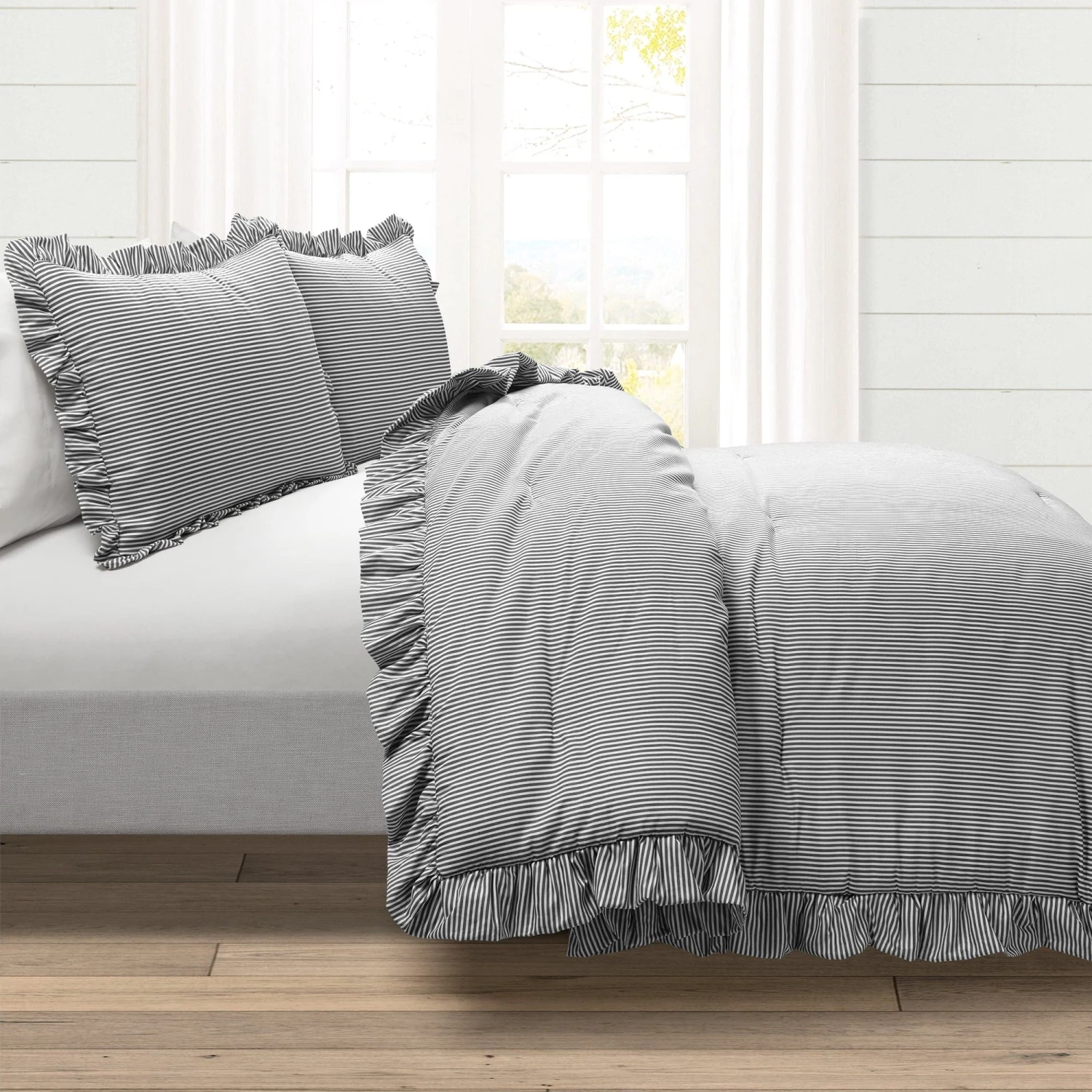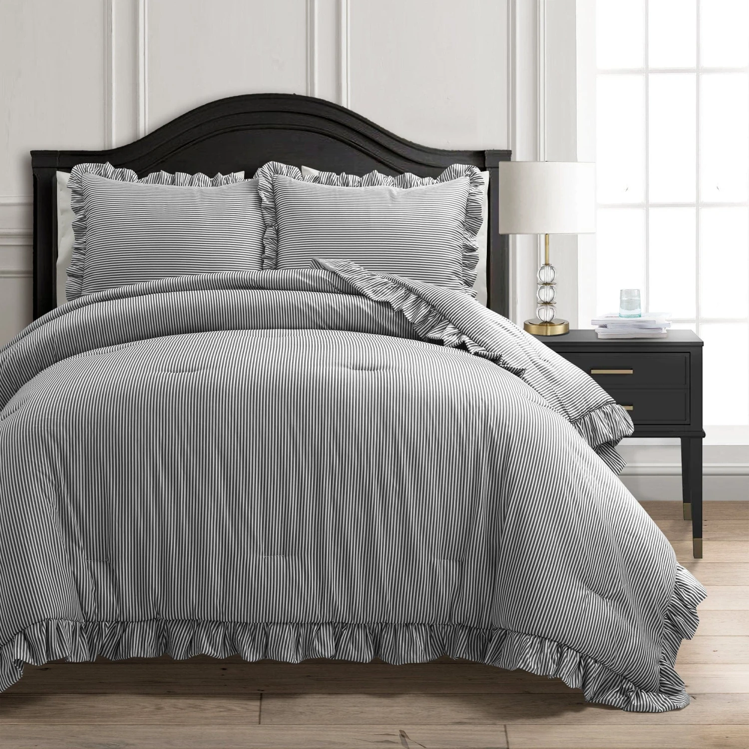 Cozy up your bedroom with a little bit of charm. This plush Farmhouse Stripe Reyna Ruffle Reversible Comforter 3 Piece Set is decorated with a simple and nostalgic stripe design. Easy to style and layer, this bedding is ideal for anyone with a traditional cottage or farmhouse styled bedroom.