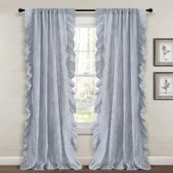 The Farmhouse Stripe Reyna Ruffle Window Curtain Panel Set is sold by the pair, so you will get two panels in each pack. Each curtain panel measures 84 inches long and 52 inches wide. It is currently available in three color options: light gray, neutral, and navy.