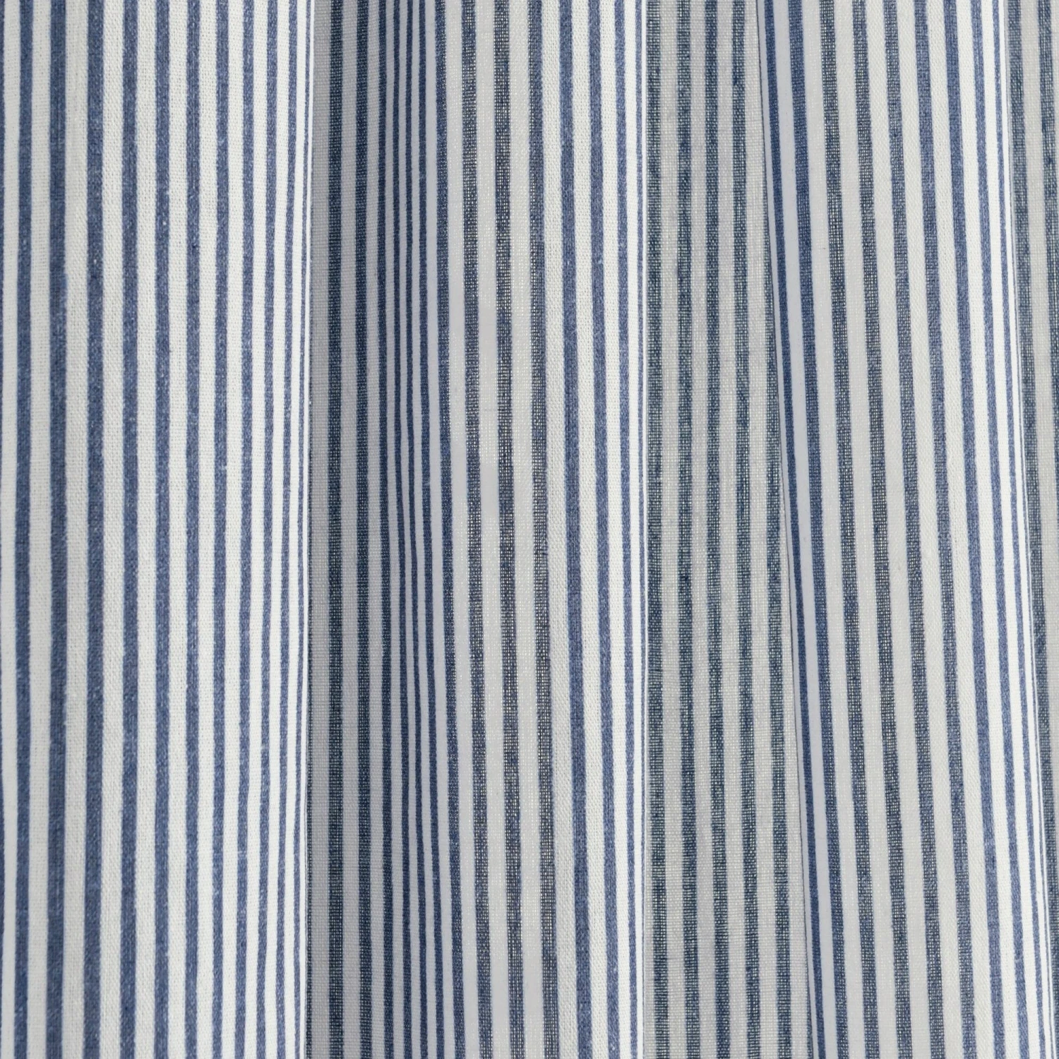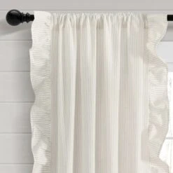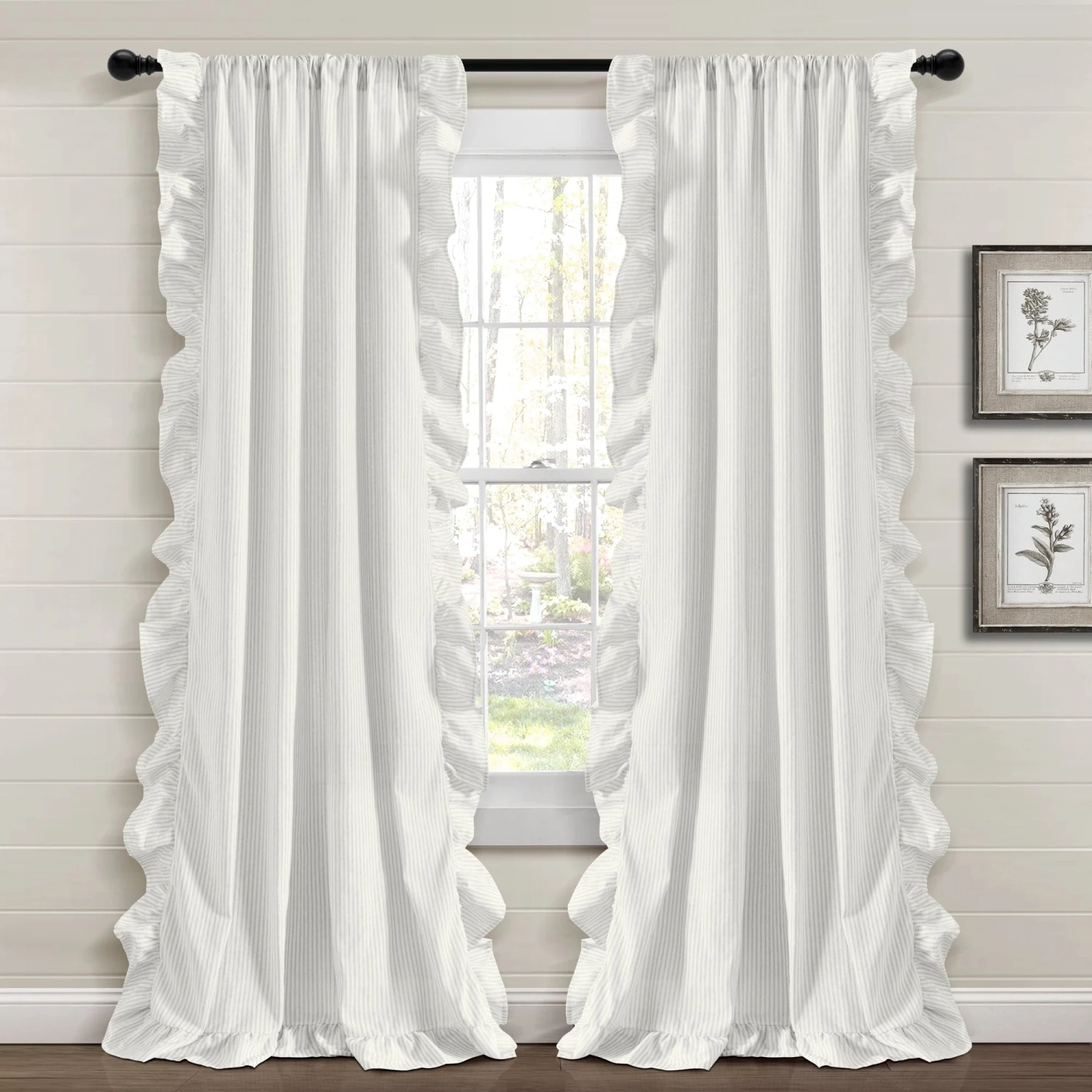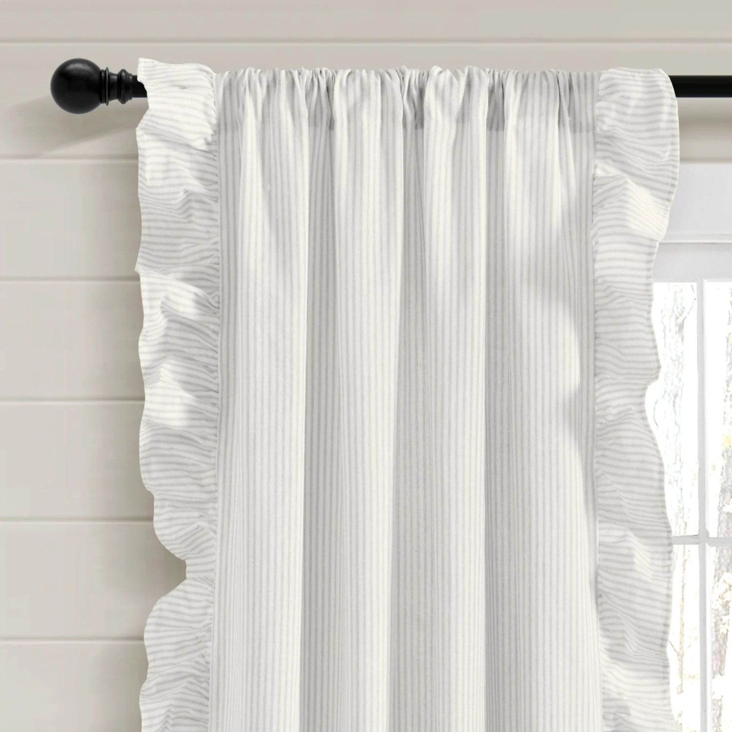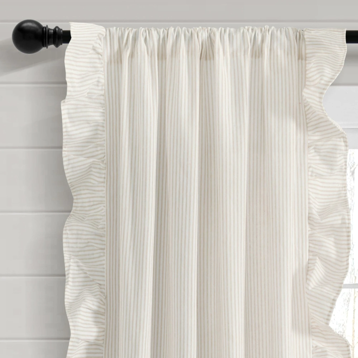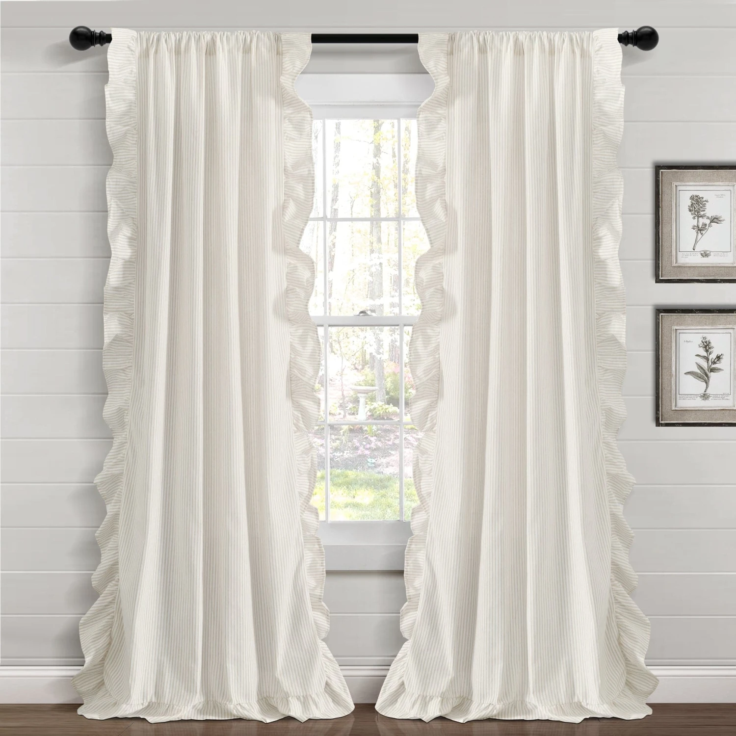 The Farmhouse Stripe Reyna Ruffle Window Curtain Panel Set is made with a three-inch rod pocket, which gives you two options for hanging these in your home. You can slip the curtain rod through the rod pocket, or you can hang the panels from the rod with clip rings for the illusion of added length.