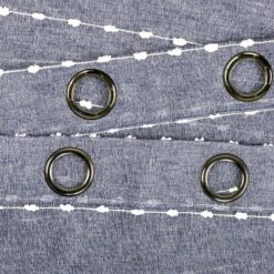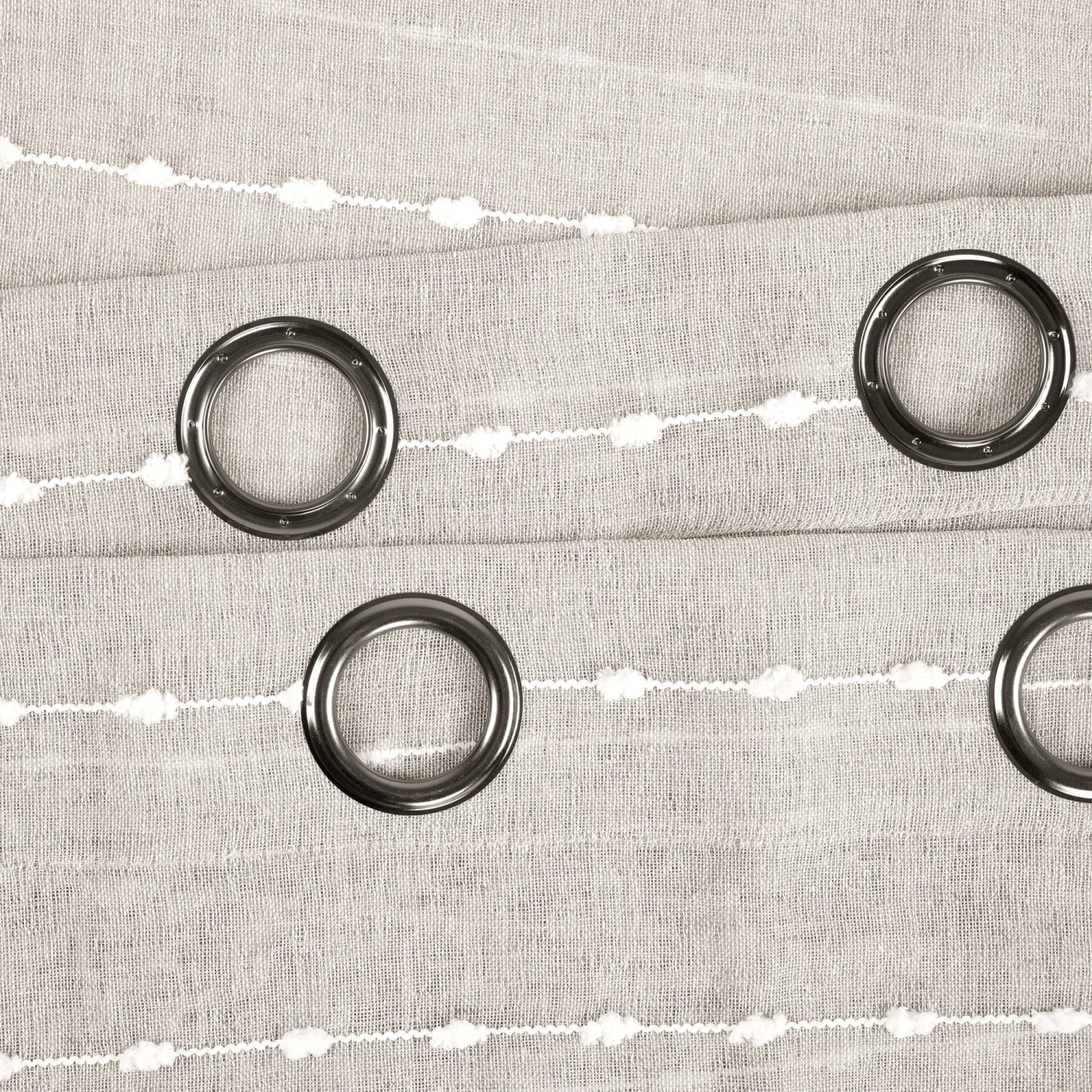 Metal grommets on the Farmhouse Textured Grommet Sheer Window Curtain Panel slide onto the curtain rod for simple installation. The grommets measure about 1.6 inches in diameter and are gun metal color.