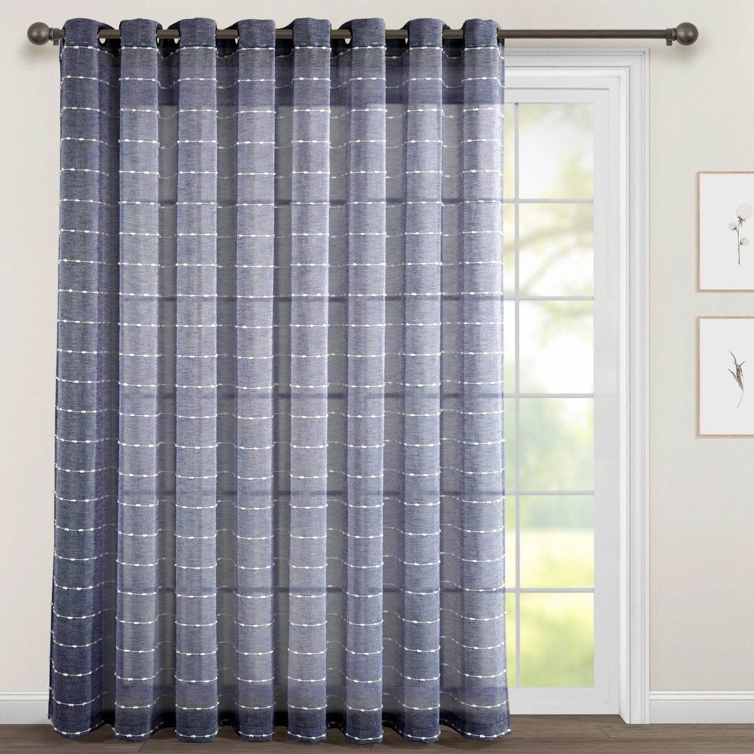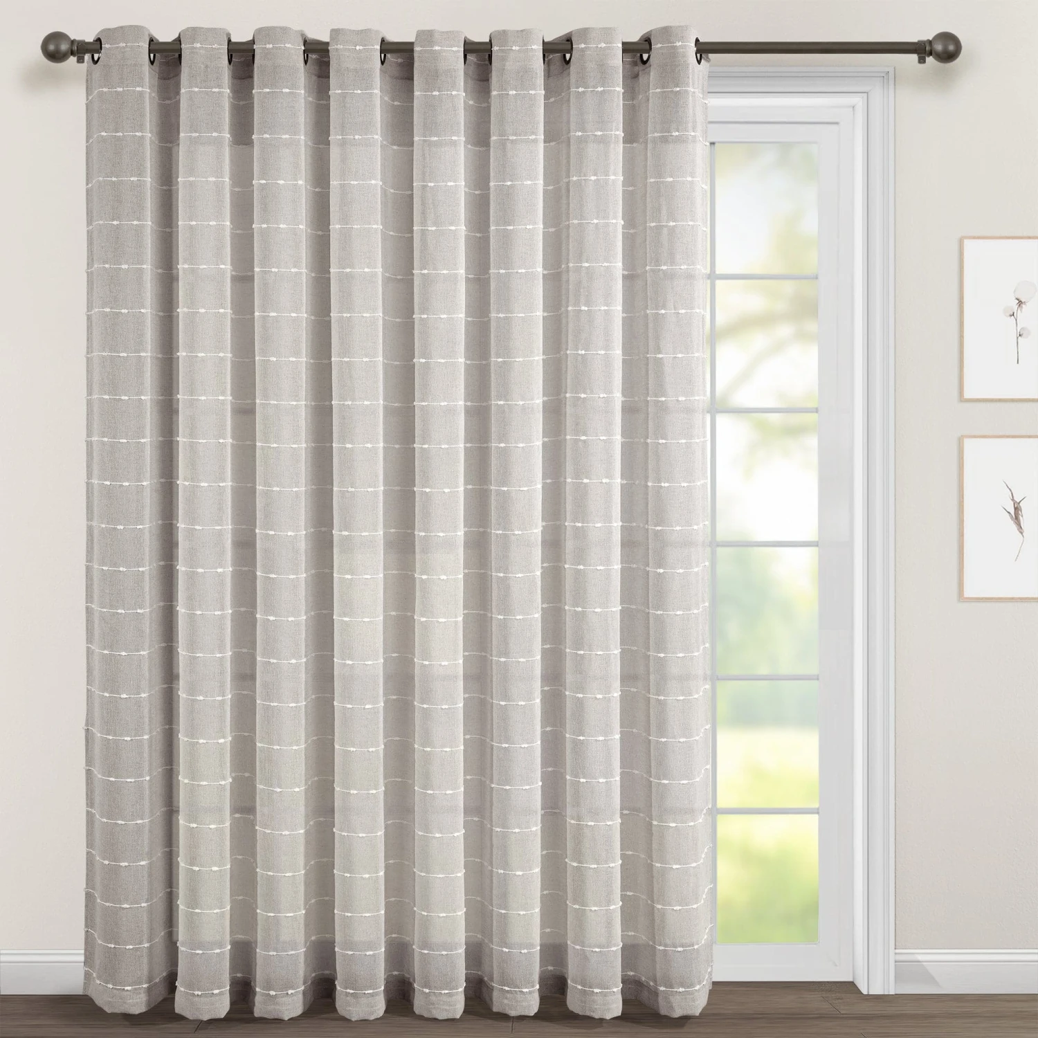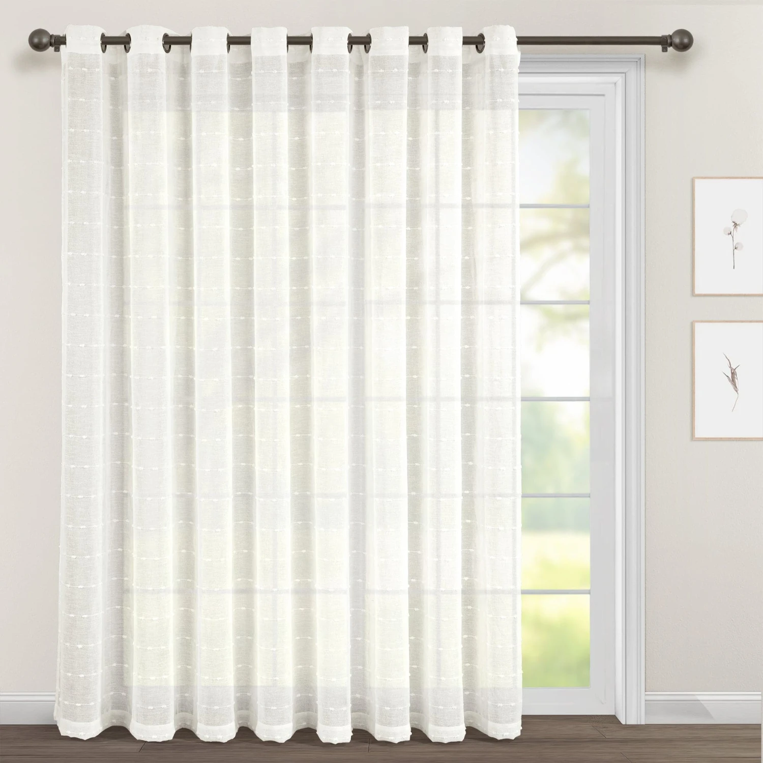 Our Farmhouse Textured Grommet Sheer Window Curtain Panel is available in multiple neutral color options, making it easy to match your existing decor. Each panel is 115 inches wide for very large windows or sliding doors. The panels are offered in 84 inches length and sold by the single panel.