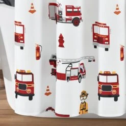 If your child has big dreams of becoming a firefighter or other first responder, this pattern will really encourage him or her to let their imagination run wild during bath time. The pattern on this Fire Truck Shower Curtain includes bright red fire trucks that pop off the solid color background, safety gear, cones, hydrants, and extinguishers.