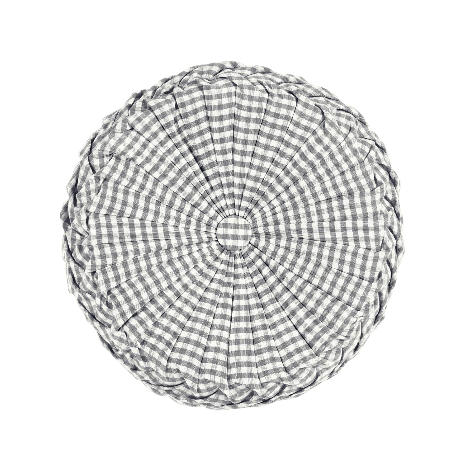 This circular accent pillow measures 14 inches in diameter. This Gingham Check Yarn Dyed Pleated Decorative Pillow is a standard size that is large enough to make an impact on your design but not so big that it will take over the look of the room.