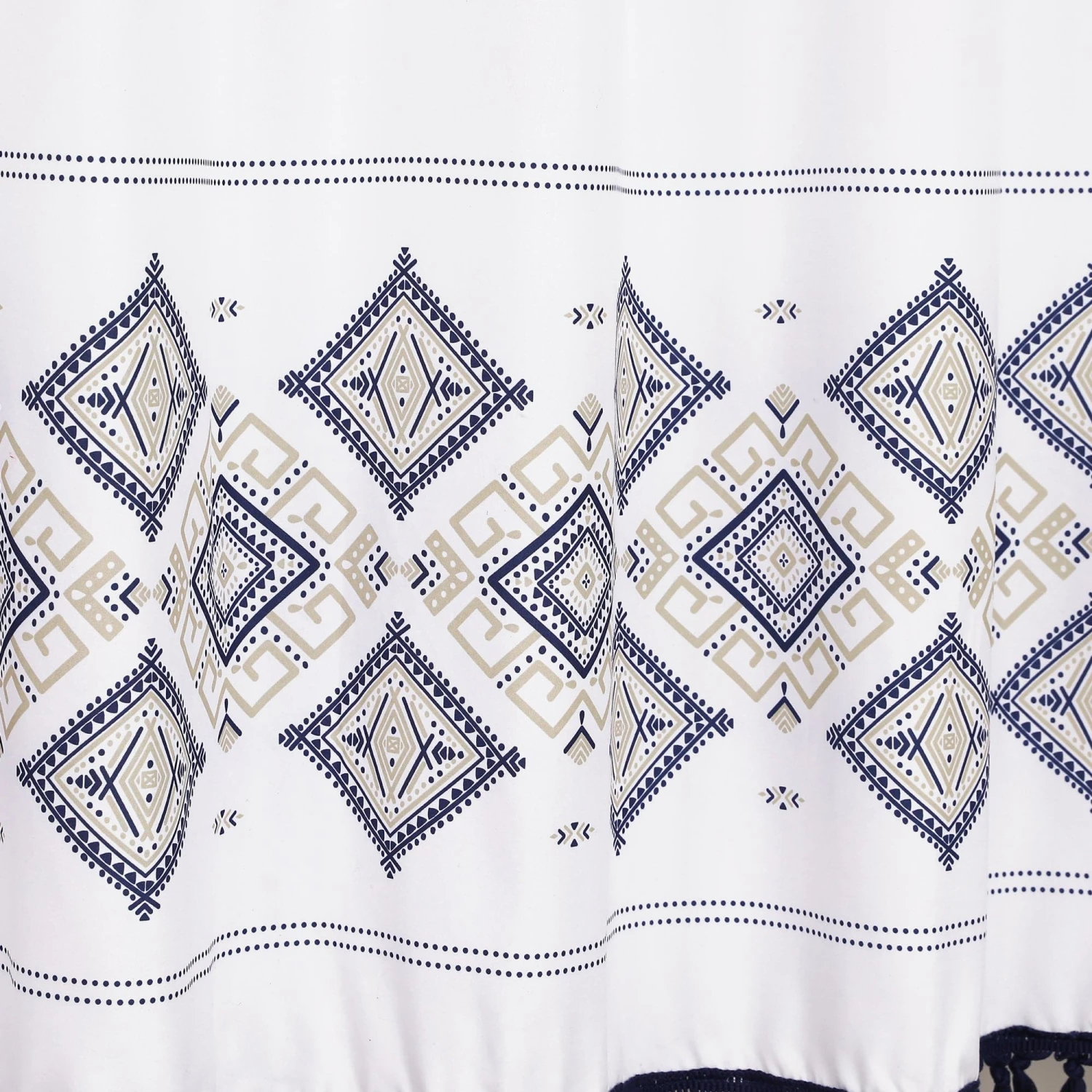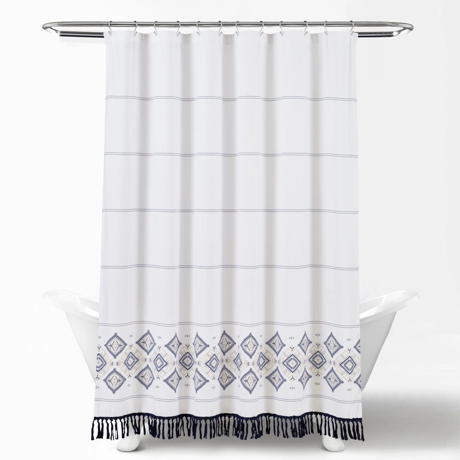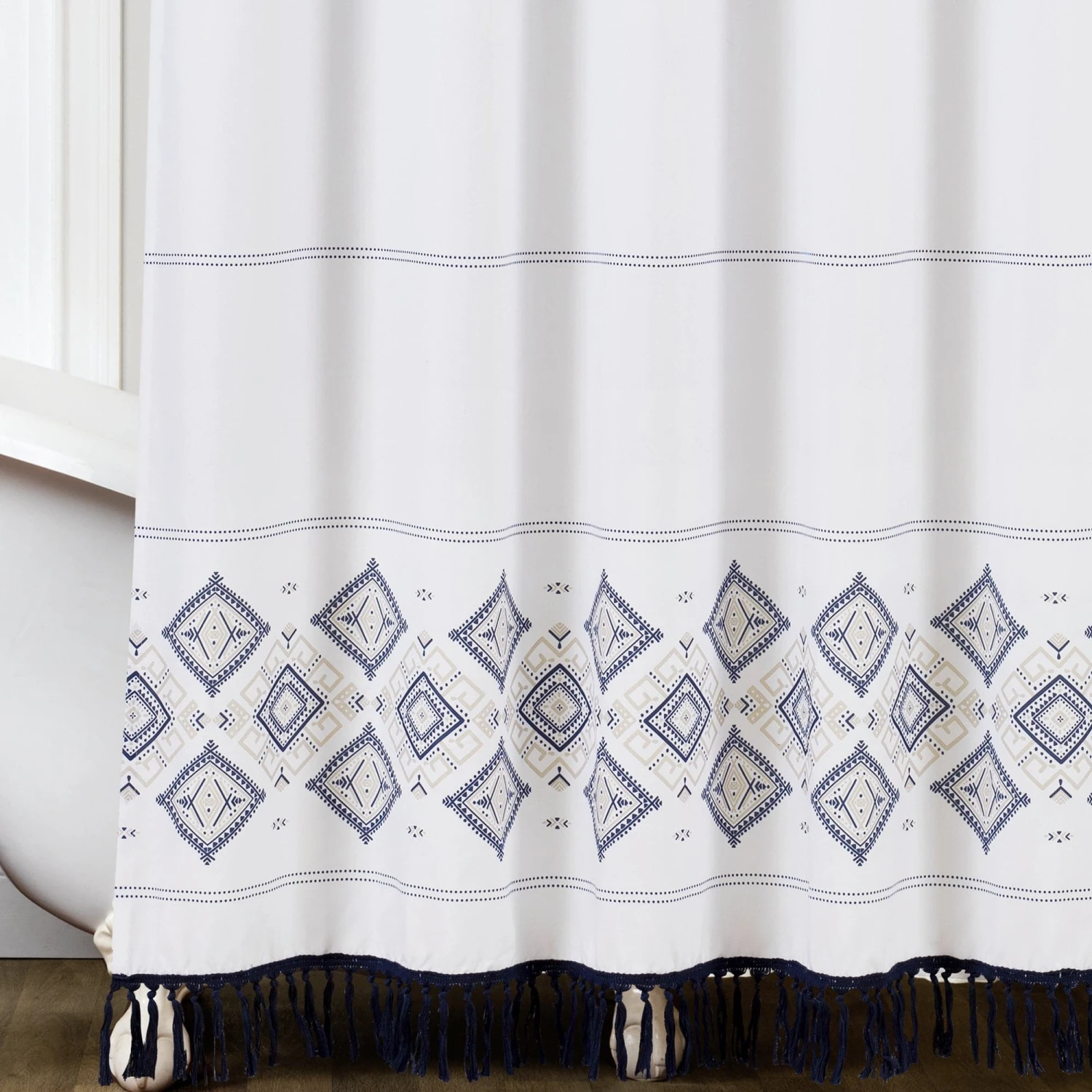 Stylize your bathroom with this unique shower curtain. The pattern at the bottom features an Aztec inspired design that creates the perfect calming vibe for your bathroom decor. Fringe detailing hangs from the bottom of the Hanna Aztec Shower Curtain for added style.