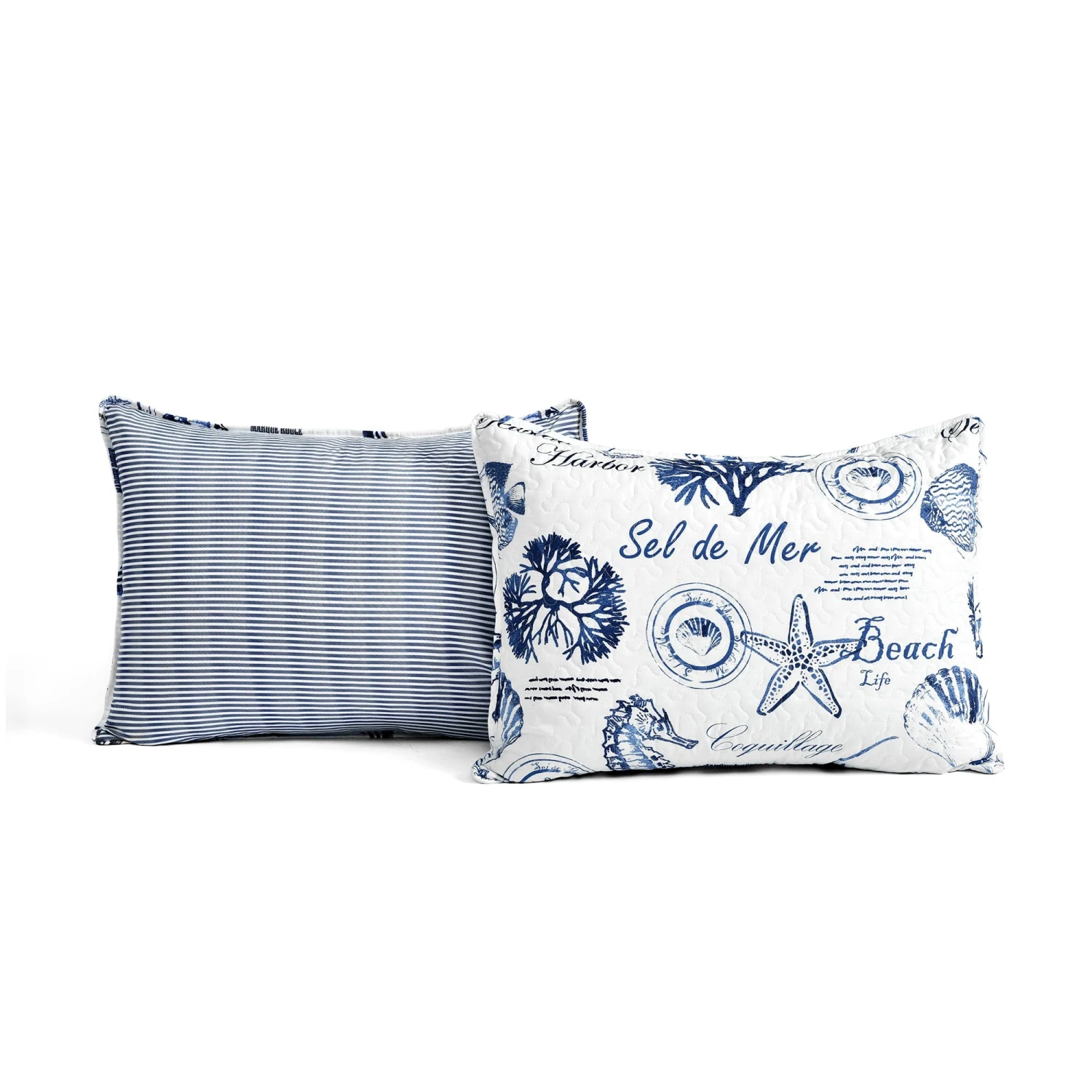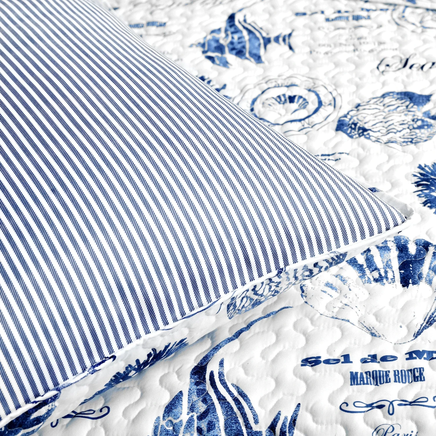 The reverse side of the Harbor Life Reversible Quilt Set is thin blue and white stripes. The reversible nature of this quilt gives you the option to switch up the look of your room as often as you like just by turning the quilt over to the other side.