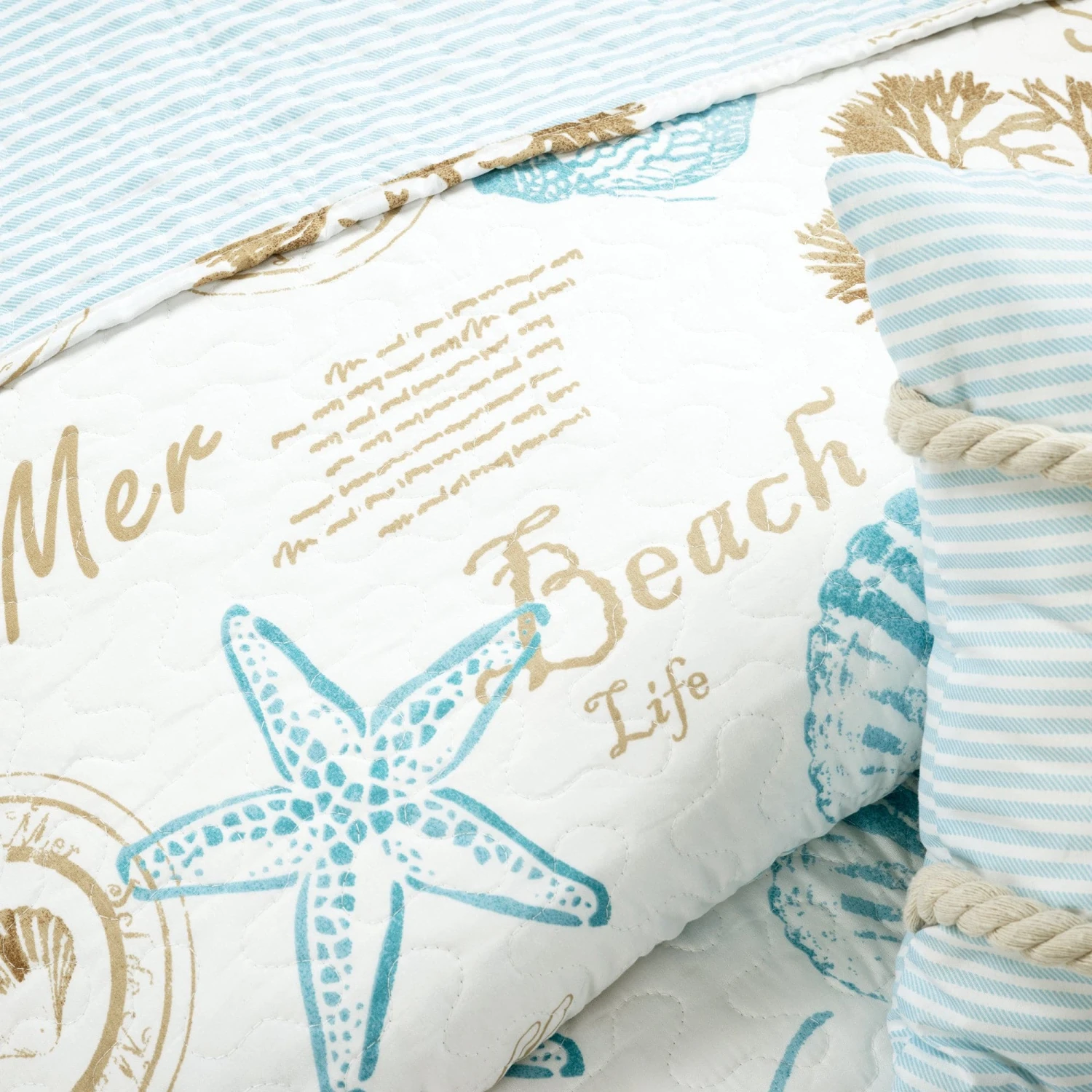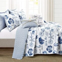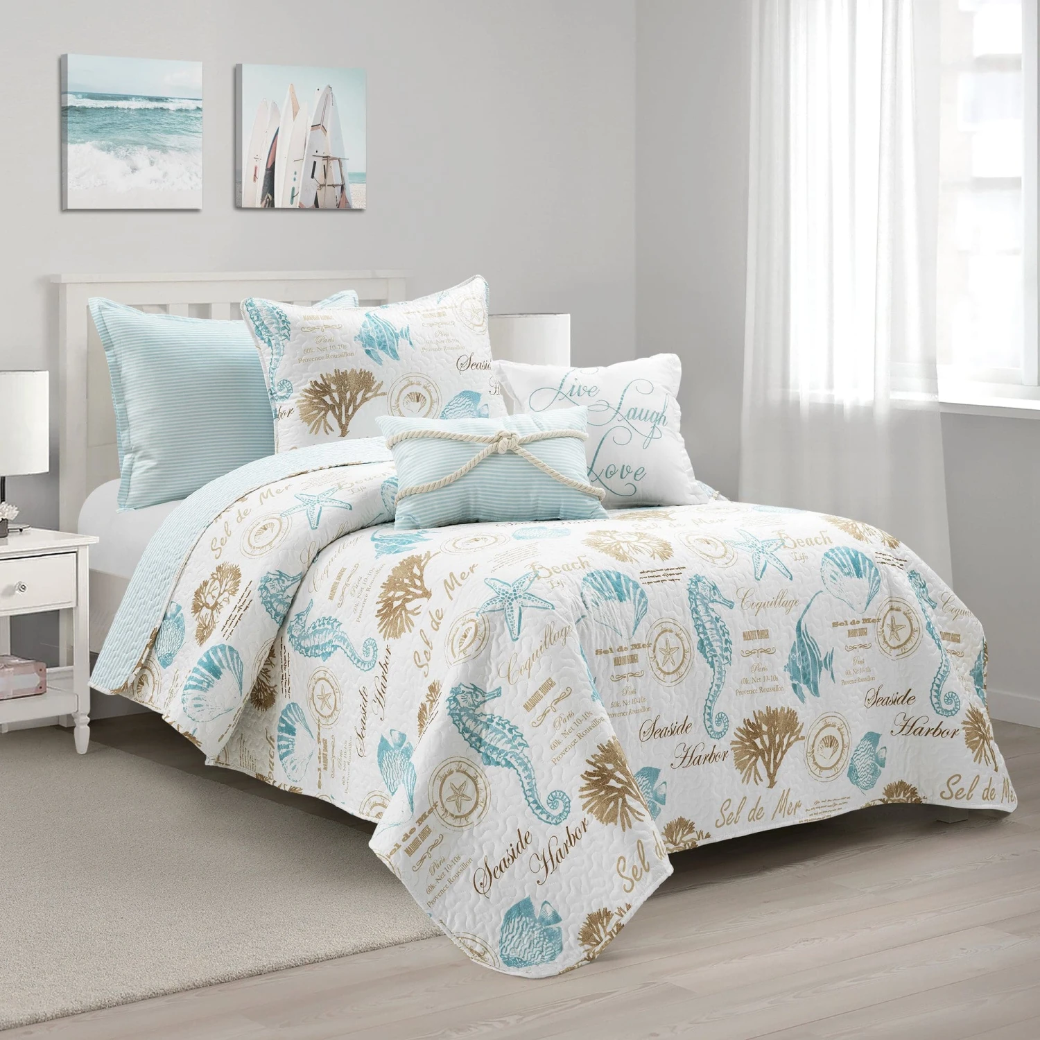 Star fish, seahorses and reefs combine to create a stunning reversible quilt set perfect for your beach home or your beach-themed bedroom. The Harbor Life Reversible Quilt Set features soft colors to create a peaceful atmosphere perfect for sweet dreaming.