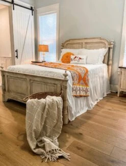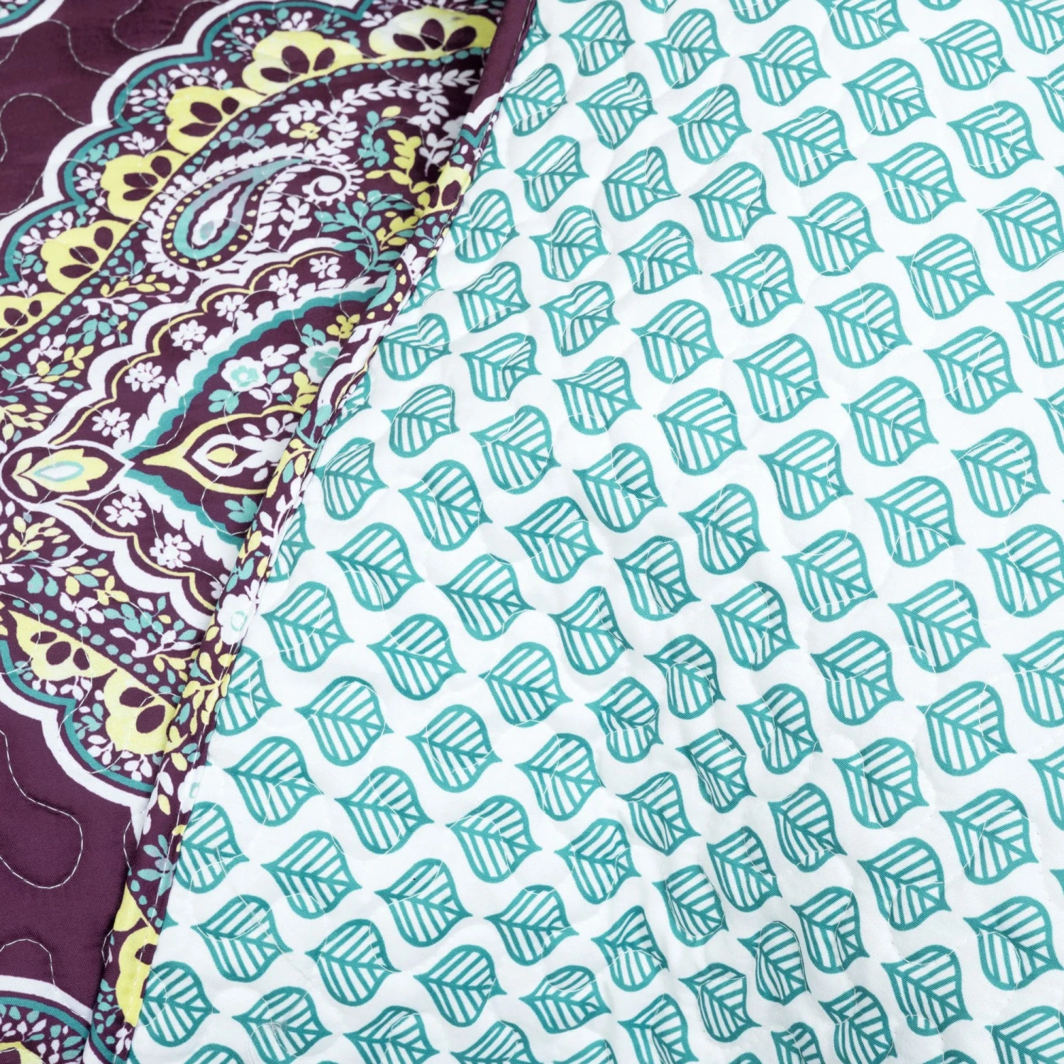 This reverse side of the quilt features a leaf pattern in white against the soft blue shade. It’s a stark difference from the front so you can easily create a whole new look in your space simply by flipping the quilt and/or shams over to the other side.