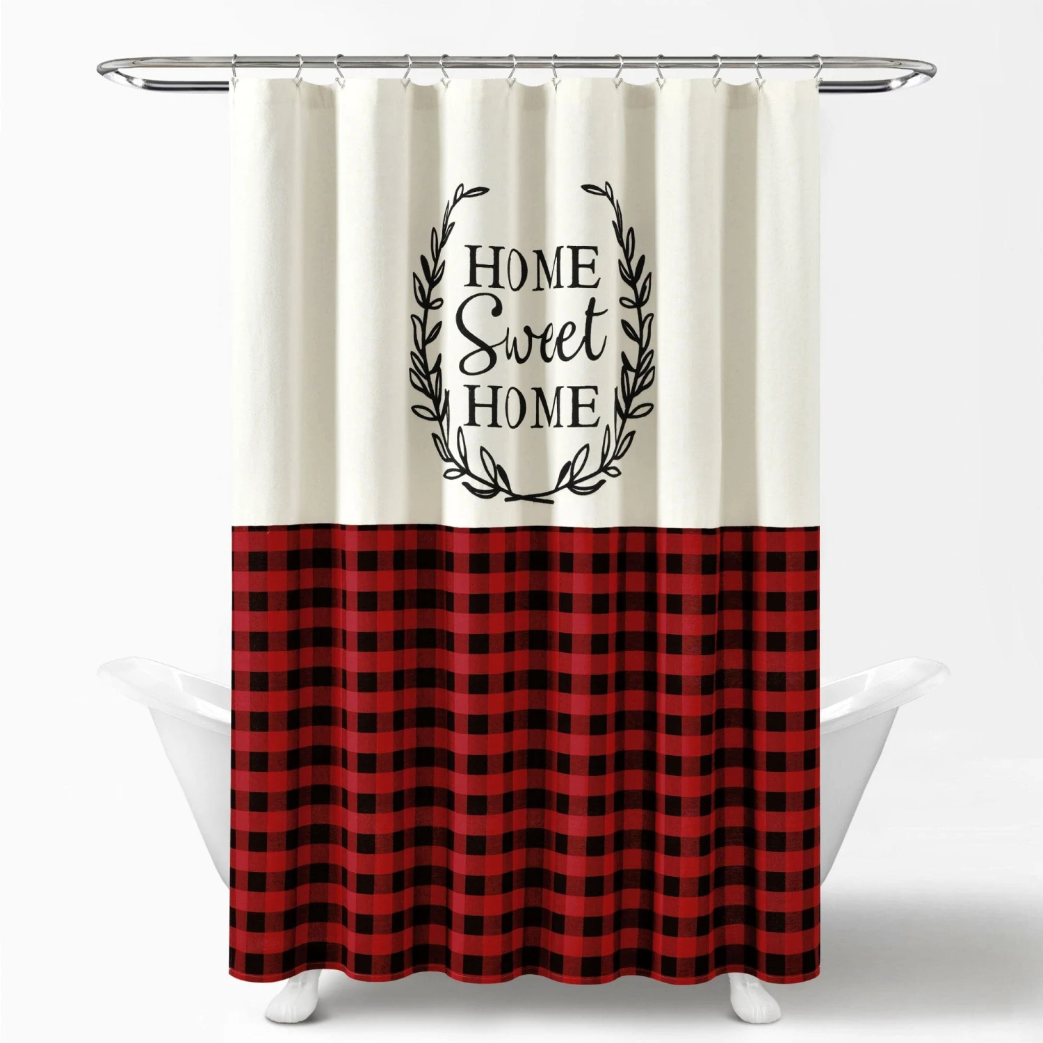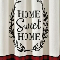 Give your master or guest bathroom a homey and comforting lodge feel with this new Home Sweet Home Wreath Shower Curtain. The faux linen fabric top has the phrase “Home Sweet Home” and a wreath embroidered into it. The bottom half features a cozy buffalo check pattern.