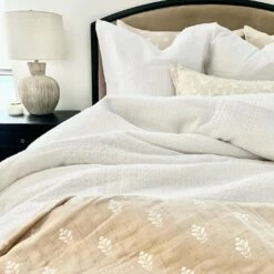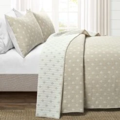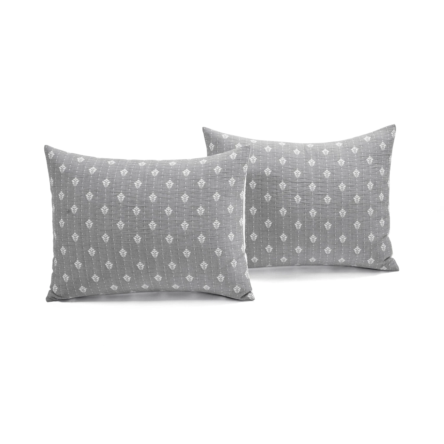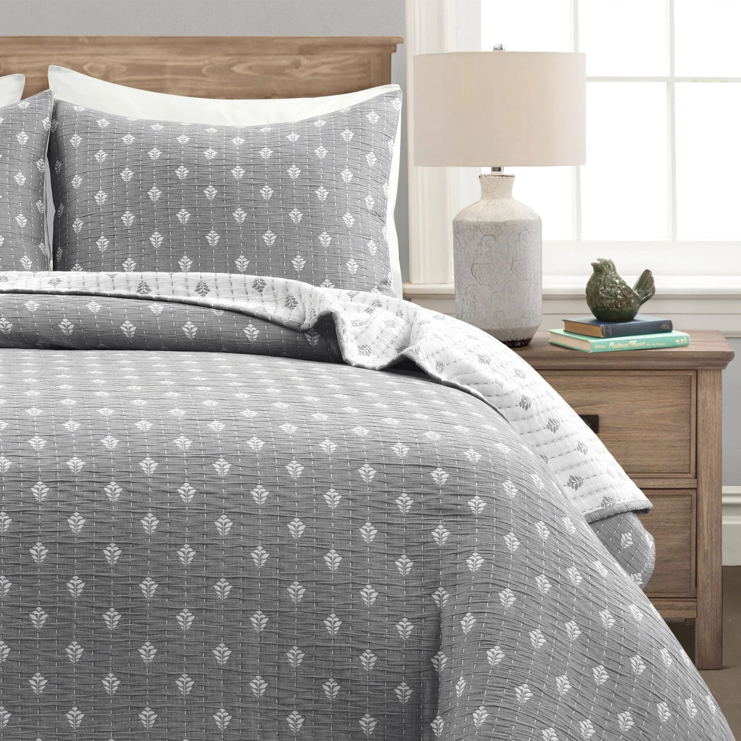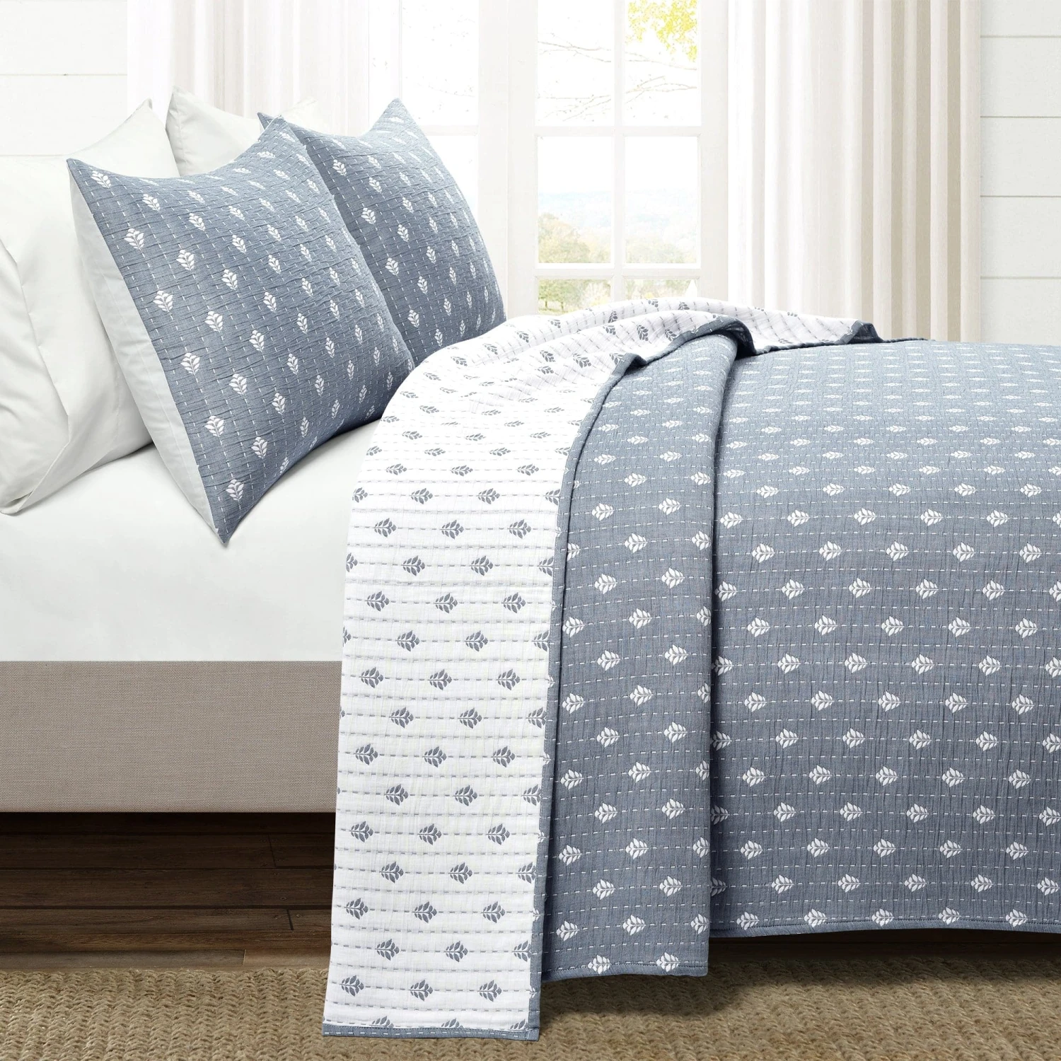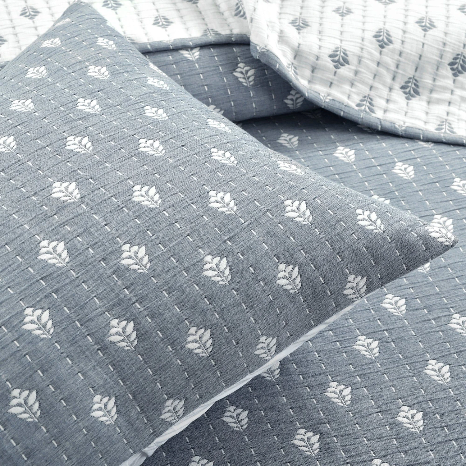 Refresh your bedroom design with this 3-piece reversible cotton quilt/coverlet set. The front and back feature a subtle leaf pattern, perfect for hygge, bohemian, or cottage design styles. Use the Hygge Kantha Pick Stitch Yarn Dyed Cotton Jacquard Quilt/Coverlet Set as stand alone bedding or a layering piece.