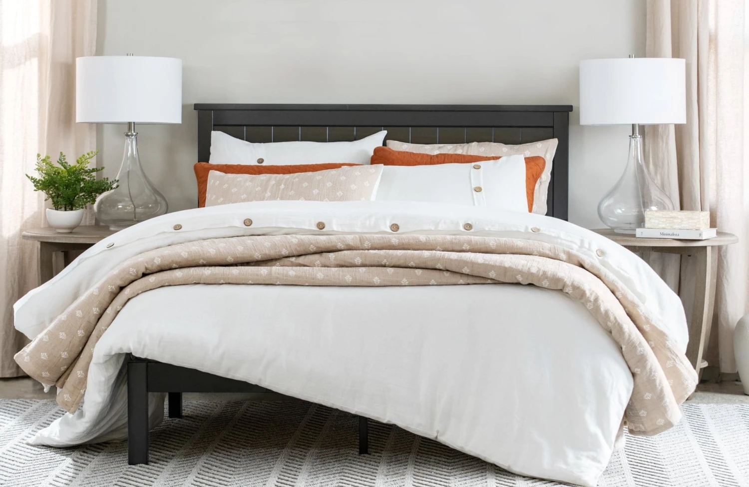 - Full/Queen: Quilt: 90″H x 90″W; Shams: 20″H x 26″W