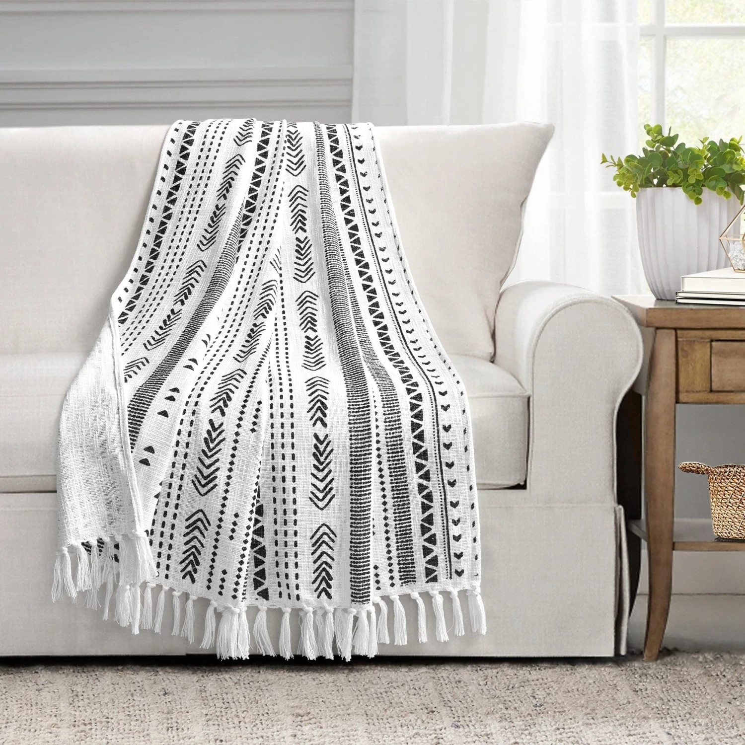 Update your bedroom or living room with this stylish and cozy Hygge Stripe Cotton Slub Tassel Fringe Throw blanket. The unique stripe pattern is more modern, while the large fringe tassels at the top and bottom have a more vintage look.