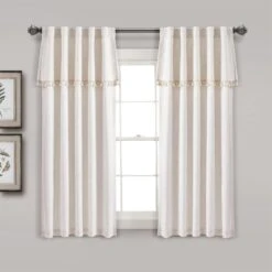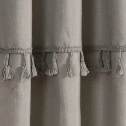 The Ivy Tassel Window Curtain Panel Set is sold by the pair and each individual panel measures 40 inches wide. You have a choice of three lengths, including 63 inches, 84 inches and 95 inches. This set currently available in two color options: neutral and gray. However, all sizes may not be available in all colors.