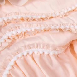 Because the ruffles and pompoms are very delicate, this set is dry clean only. Please do not risk the integrity of your quilt set by placing it in a washing machine.