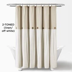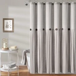 The pleats in the faux linen fabric give this Linen Button Shower Curtain a more textured look. The slight weave variations are authentic to this natural fiber blend and create a relaxed look.