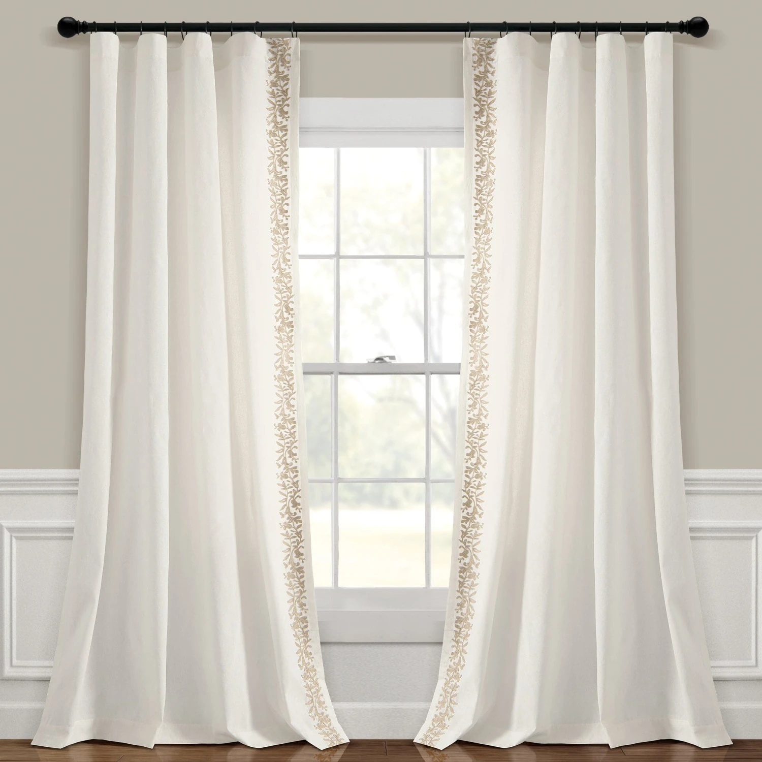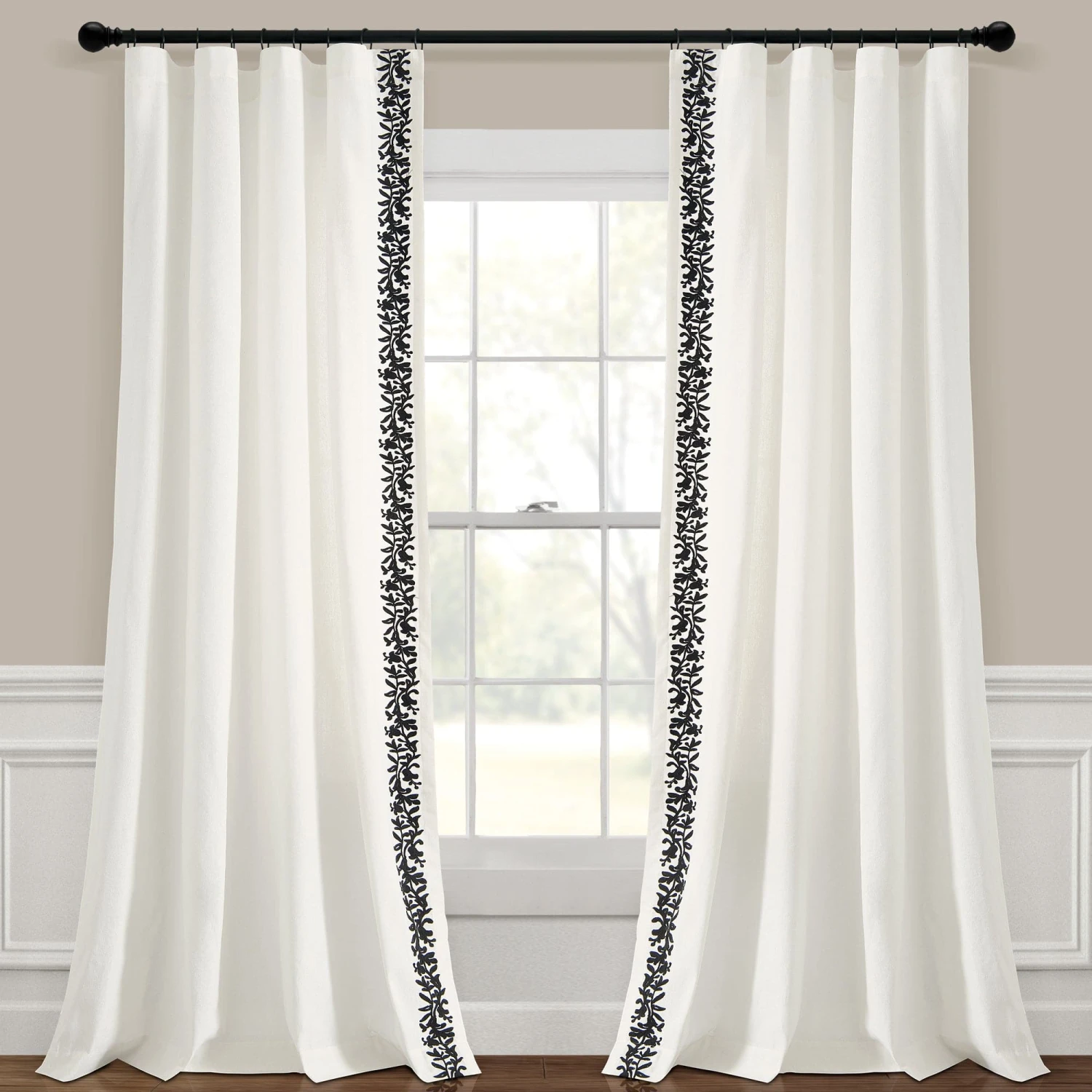 This style is sold by the single panel, so if you need to replace one panel or need an odd number of panels to cover your windows, you won’t have to purchase more than you need. However, you will need to purchase two panels to get the look in the photos. Each Luxury Modern Flower Linen Like Embroidery Border Window Curtain Panel measures 84 inches in length and 52 inches in width.