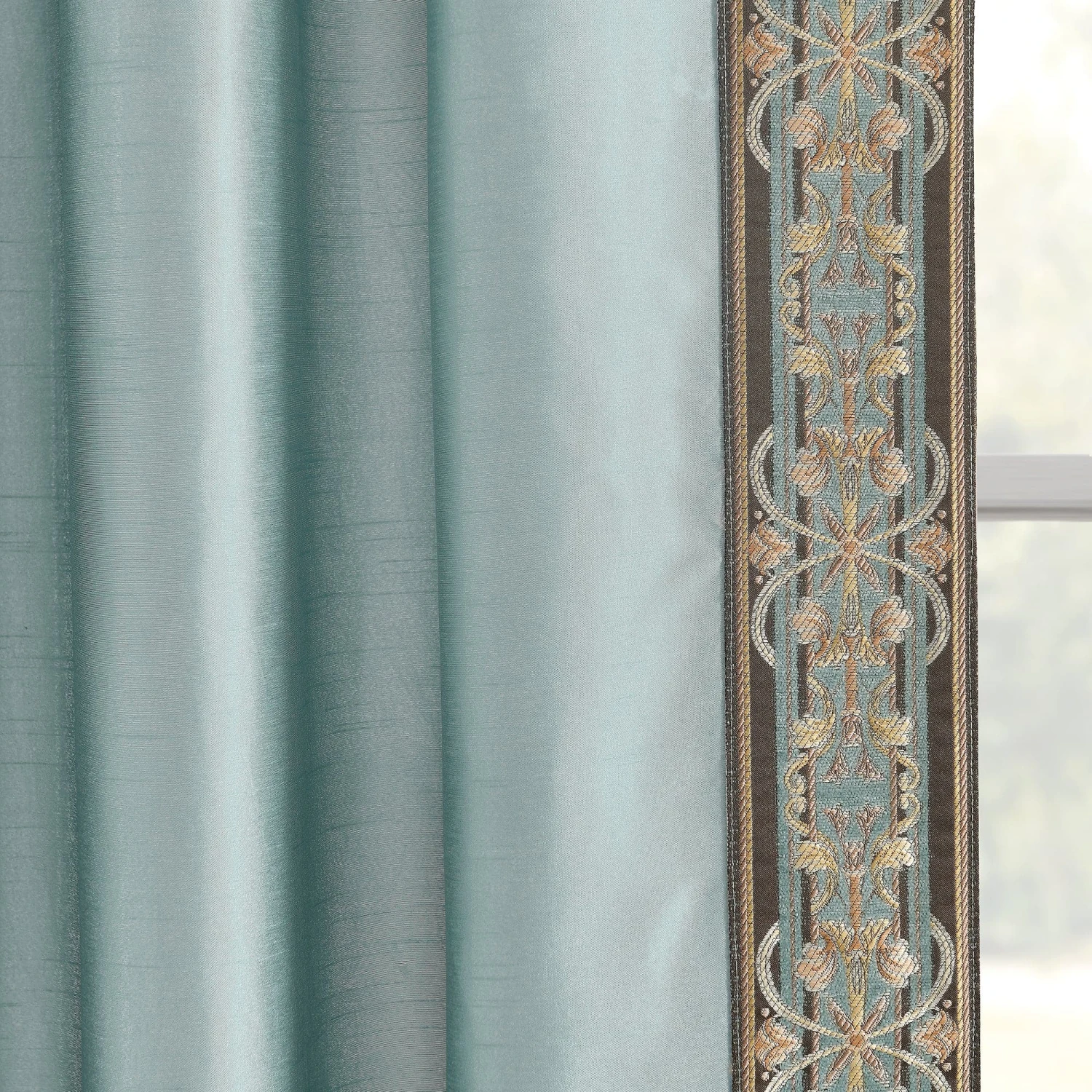 Trimmed, textured and boasting a custom look, this elegant Luxury Traditional Regency Faux Silk Border Trim Window Curtain Panel decorates your home with a high end style. The luxurious look is accentuated by the intricate jacquard border, adding a regal style to the design.