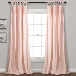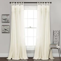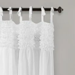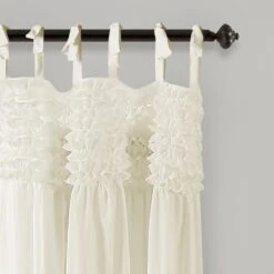The Lydia Ruffle Window Curtain Panel Set is sold by the pair and each individual panel measures 40 inches wide. These panels are available in your choice of 63-inch, 84-inch or 95-inch lengths (some colors may not be available in all sizes). This set is currently available in four color options: pink blush, white, gray or ivory.