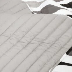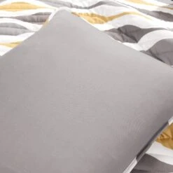 This style is currently available in your choice of three color combinations, including gold and gray; turquoise and orange; and black and gray. Each color of the Mid Century Geo Reversible Quilt 3 Piece Set is offered in your choice of full/queen or king size.